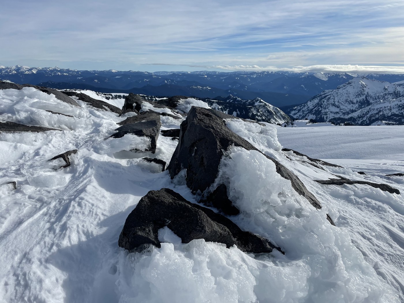 Snow starts right out of the parking lot. Snowshoes or skis advised as post-holeing up to your knees would happen without them in some spots. Past Panorama point the snow becomes icy at times, therefore snowshoes, skis, or micro spikes still needed. There are a few difficult terrain spots where the snow has built up a ridge. Also beware of exposure on some of the steep slopes. I did not have one but I wish I brought my ice axe.