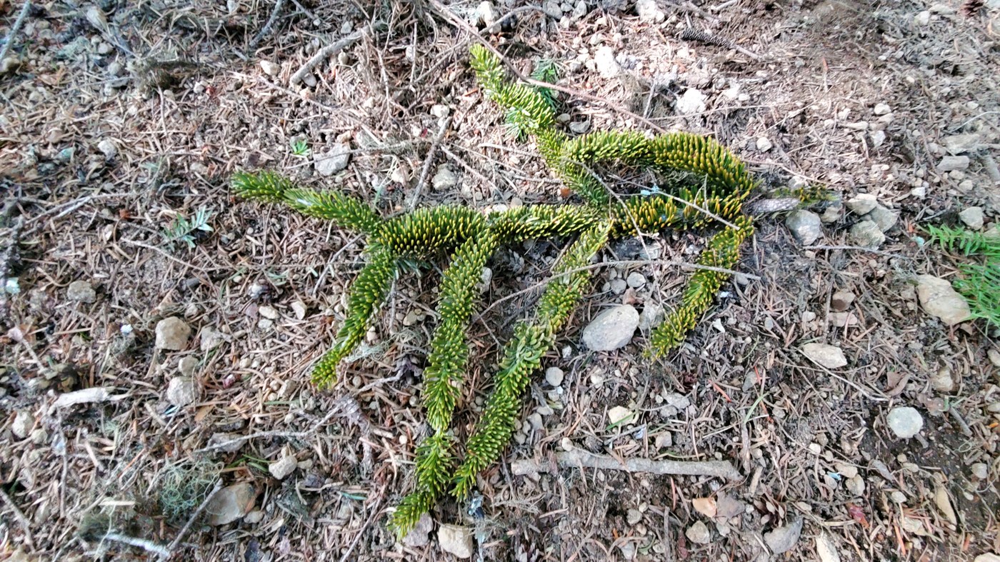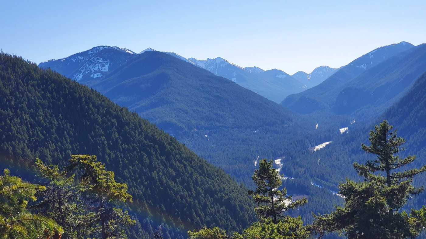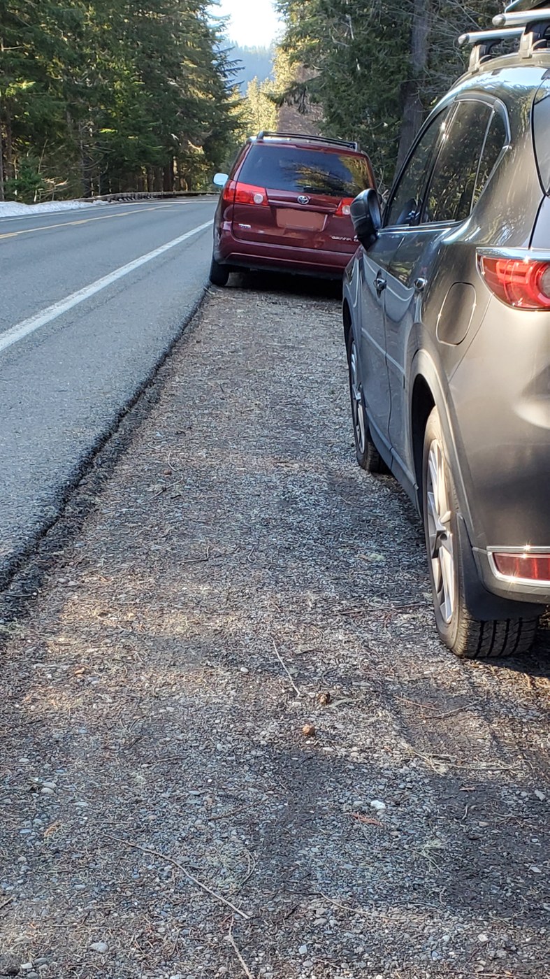 We left home and it was in the low 40s with a biting wind blowing. As we drove up 410 the temp was anywhere between 46 and 61 settling down to 53 when we arrived to the Buck Creek turnoff. We pulled a u-turn and parked alongside the road halfway on the berm of snow. It was hard packed and I drove back and forth a few times just to be sure. This would be the most snow on our trip today. As we got out of the car there was a surprisingly warm breeze blowing and made me question wearing long sleeves. We headed up the hill to the White River Trail and headed toward Ranger Creek. 0.1 mile there's a huge tree across the trail with its full branches hanging down. It was like walking through a series 10 of beaded curtains to get past, but not difficult. Within 0.5 miles we had to remove coats and the long sleeves as it was so warm - even in the shaded forest. There were about 11 trees down - the one of which you had to sit on and swing your legs over, one you had to cut the corner, but most could be stepped onto or over. They would all be difficult for bikes. Stopped at the viewpoint 2.5 miles up and got some sun on our faces. From that point the trail had lots of debris - nothing inhibiting - just an observation. Saw a 30 foot section of snow covering 90% width of the trail and that was it up to the burned section where we turned around about 3.7 miles. Not only was the trail snow-free, it was dry and crunchy sounding with most steps. The only other sounds today were the off and on of Ranger Creek. Very peaceful! Got back down and saw a couple and their 5 or 6 dogs near the car, but no one else.