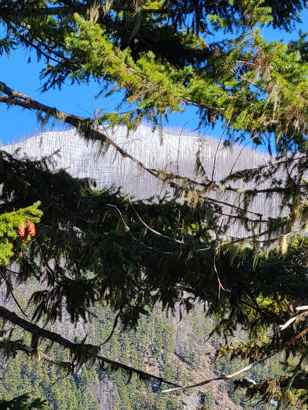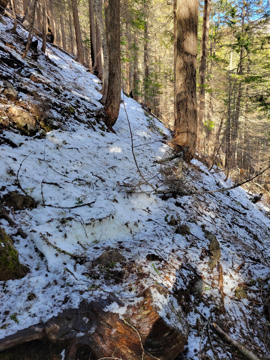There were about 6-8 blow-downs along the way today, but all of then were easily navigated. If we had continued up towards Dalles Ridge, we definitely would have donned spikes. I would not continue further than we did today of you are not familiar with the trail or have route-finding skills.