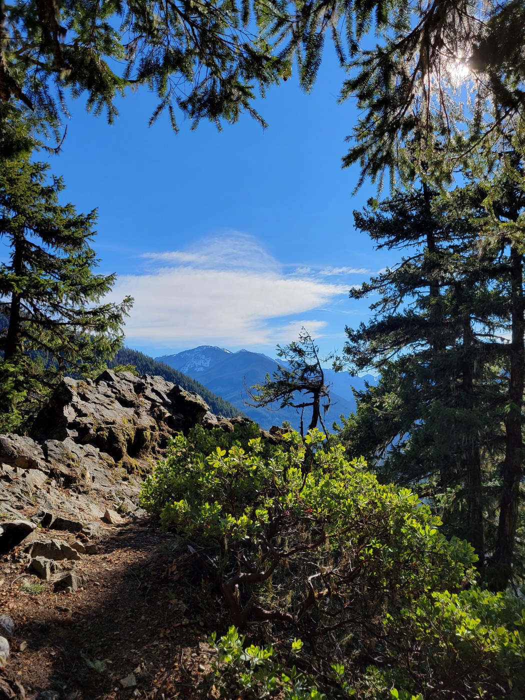 Conditions: almost zero snow from the parking lot to the LR viewpoint. There's some packed ice and snow right as you start off from the parking lot, but it disappears after about 200 feet. Neither of us used poles or spikes today--no need. Beyond Little Ranger viewpoint, there were intermittent splotches of ice, which seem to have dropped from the treetops. At about the fifth switchback (beyond the viewpoint), snow dusted the trail. Then, blam! Snow was a thing (see pic). The trail was covered, and we decided we'd had a good hike already, so headed back down to the pleasant little viewpoint for lunch. The viewpoint was sunny and dry, and we basked like sun bears on the rocks.