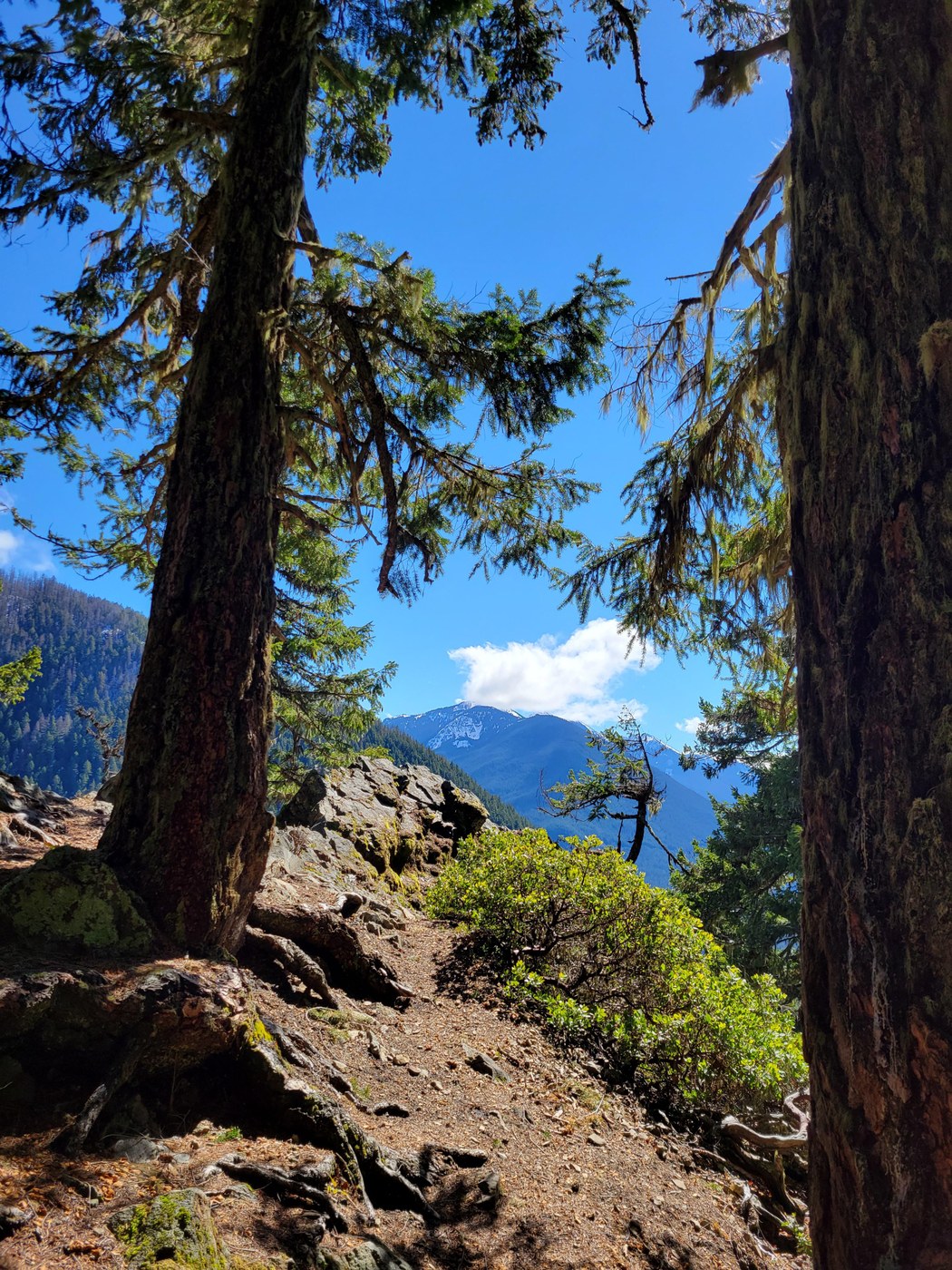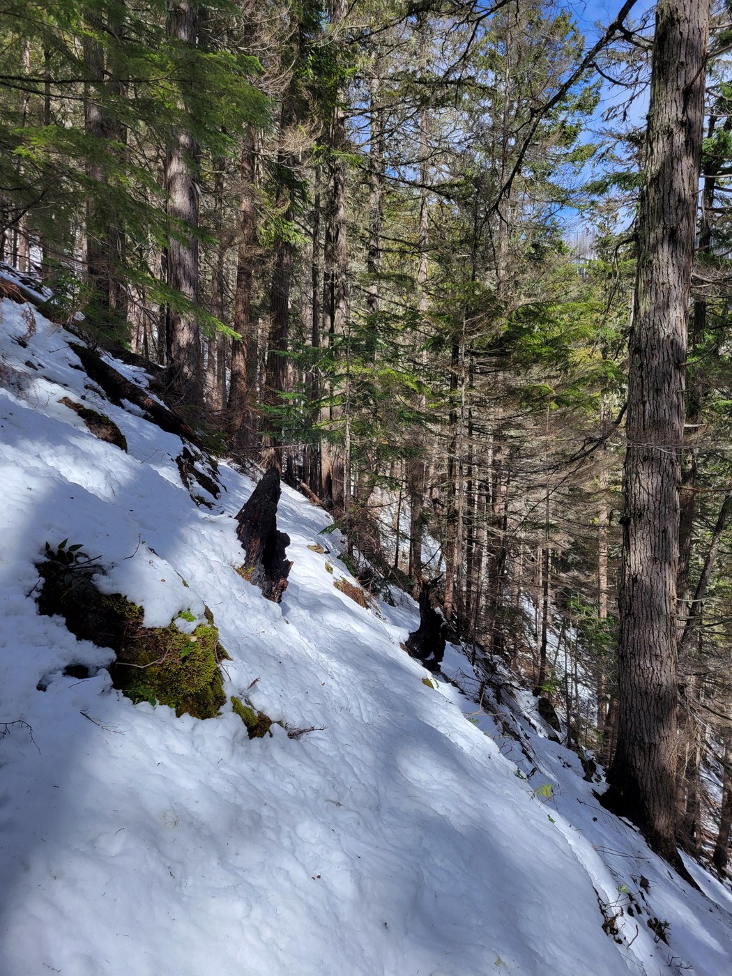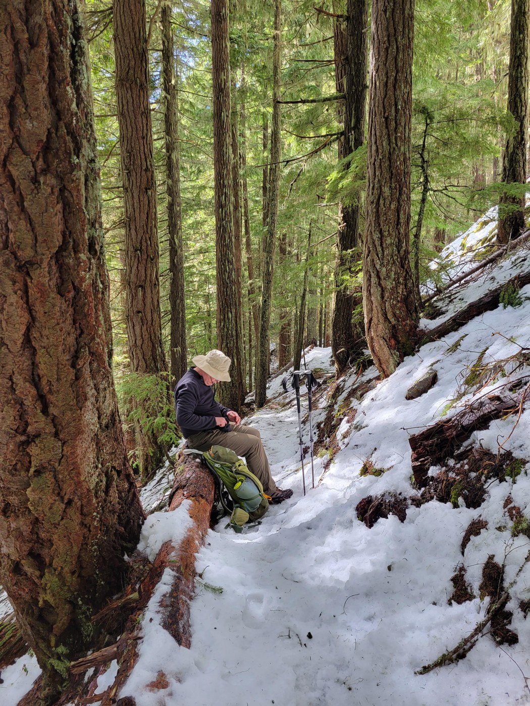 We parked at Camp Sheppard, where there's a big lot and toilet facilities (which are decent and stocked). Here, we took the White River trail 2 miles to the Little Ranger Peak (LRP) trail. Between that TH and the viewpoint 2.5 mies up, there are several blowdowns, all step-overable except one. With the exceptional one, there's a little trail that cuts to the next switchback. No snow up to the viewpoint, and the viewpoint is lovely. We had lunch there in the warm sun. From the viewpoint, we hiked up. The trail is intermittently snowy starting around the third switchback. We put spikes on along the sixth switchback--they were handy, for sure, and I'm sure we would've worn them all the way up if we'd gone that far. The snow was not terribly deep (maybe five inches at the eighth switchback), but slippery because it was in the process of melting, and the trail, at least in many places, is angled downhill and also had plenty of rocks and roots underneath, which get pretty slippery in the right conditions. We turned around when the trail crossed a minor avalanche field (which was not dangerous, just a fact) and we decided it wasn't worth it to continue trudging along. If we'd left earlier, I think we might've pursued it. It does appear that considerable snow fell over the last week or so . . . So, we headed back down to the sunny ledge and basked like turtles in the sun till heading back down.
