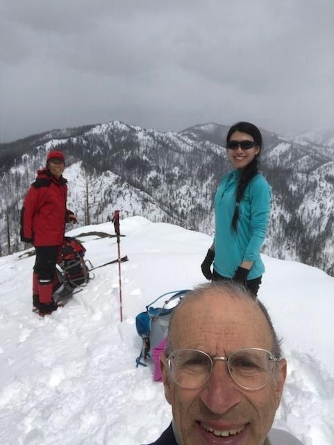 Instead the sun came out and warmed us at the summit as we ate lunch! We had considered descending to the east and making a loop. However the snow was corniced, the light conditions made it difficult to assess a safe route across the first ridge which was both narrow and steep on both sides, and none of us were carrying ice axes or helmets. So we decided to return the way we came. On the descent we made good use of the new snow and our snowshoes by plunge stepping down. It snowed prettily between episodes of sunshine. We had the mountain to ourselves all day.