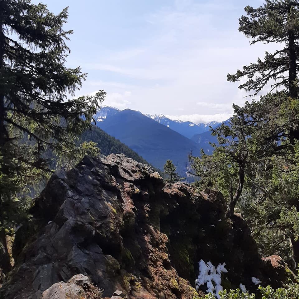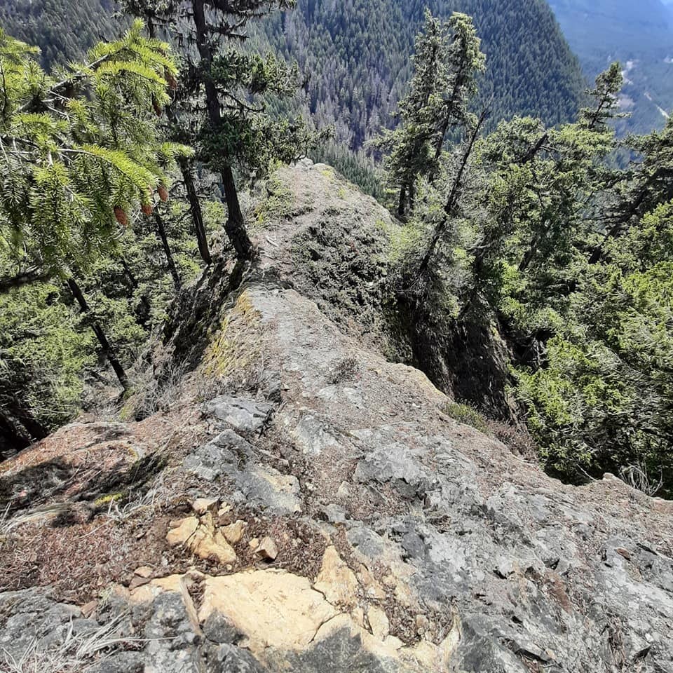 Lots of deer tracks on the trail and what appeared to be fairly recent bear prints around the lookout. From the top viewpoint there's a rib with sharp drop-offs that led to a lower viewpoint with views of Mutton Mountain and High Dalles Point. I took my pack off, climbed over the top knob and scooted down on my fanny, but easily climbed back up. Proceed with caution though if you decide to do it. The hand and foot holds weren't big. I also checked out the ridge running west, but the views didn't improve, and I wasn't about to climb the outcrop there. Great day to be outside.