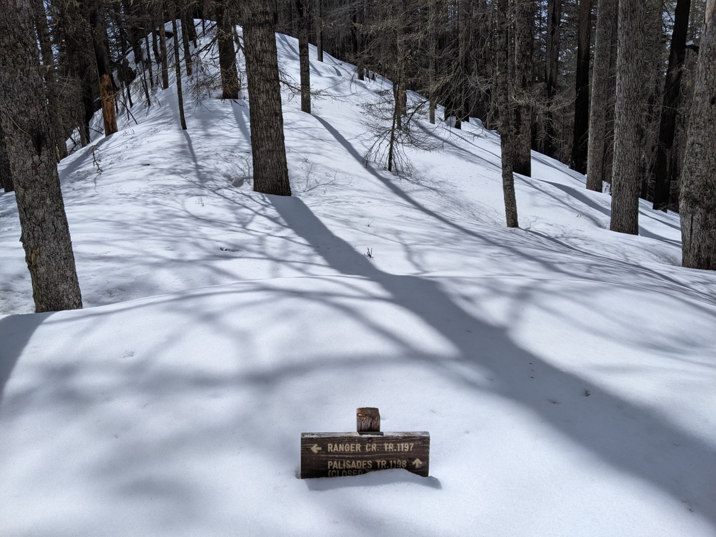 From here, there were few, if any, signs of the trail route so I simply followed the ridge-crest through the black stick forest, making a wrong turn here or there to go around the wrong side of a bump on the ridge. I know that I wasn't following the exact trail as I never saw the large sign describing the Palisades trail that was present a couple years ago. From previous trips, I knew that the trail would pass within feet of the old shelter site, so I used that as my next known-good point on the trail, hoping that the snow would be melted again as I started to drop off the ridge.