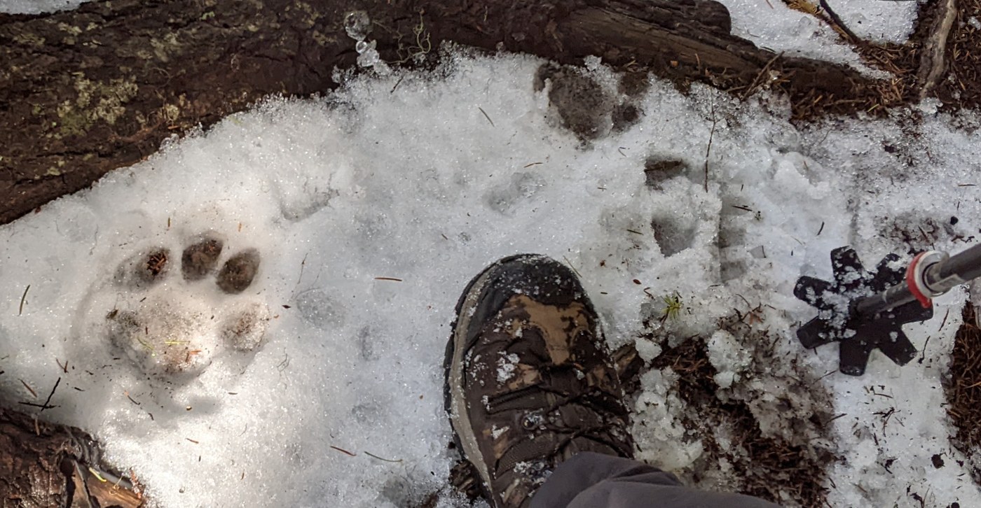 Thankfully, I could now see the trail cut and boot prints that followed it, improving my pace, but still maintain caution on the extra sloppy snow. Between 4400ft and 4150ft I shed my snowshoes and shortly thereafter my gaiters as the trail was starting to regularly return to dirt in places. In the vicinity of the viewpoint junction around 3900ft I saw yet a couple more cougar prints in the ever thinning snow.