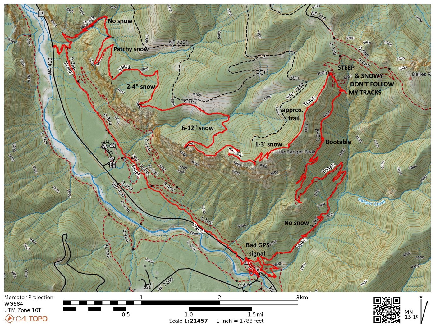 DO NOT FOLLOW MY SNOWSHOE PRINTS in the upper-most switchback basin (4600ft to the saddle). Unfortunately, my hope for less snow on this trail was a pipe dream. In fact, the trail was nearly impossible to locate as the hillside began dropping into the creek drainage. While I started down the trail, the hillside was steep enough that chunks of ice/snow from the size of a fist to the size of a 3-liter water bladder would fall from trees or simply start sliding down the very slushy hillside that was covered in approximate 2 feet of snow. I really should have checked avalanche conditions from NWAC before the trip, and likely turned around here for safety. Rather than crossing and re-crossing the visible flowing creek in the gulley, I instead opted to very carefully directly descend the hillside in my snowshoes, often using a trekking pole as a stop to keep from accidentally skidding down the hill.