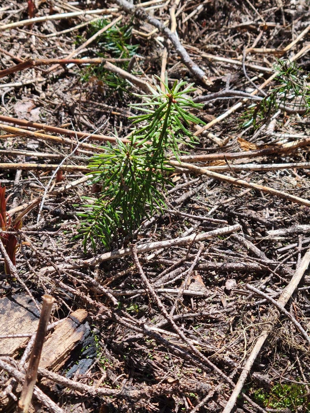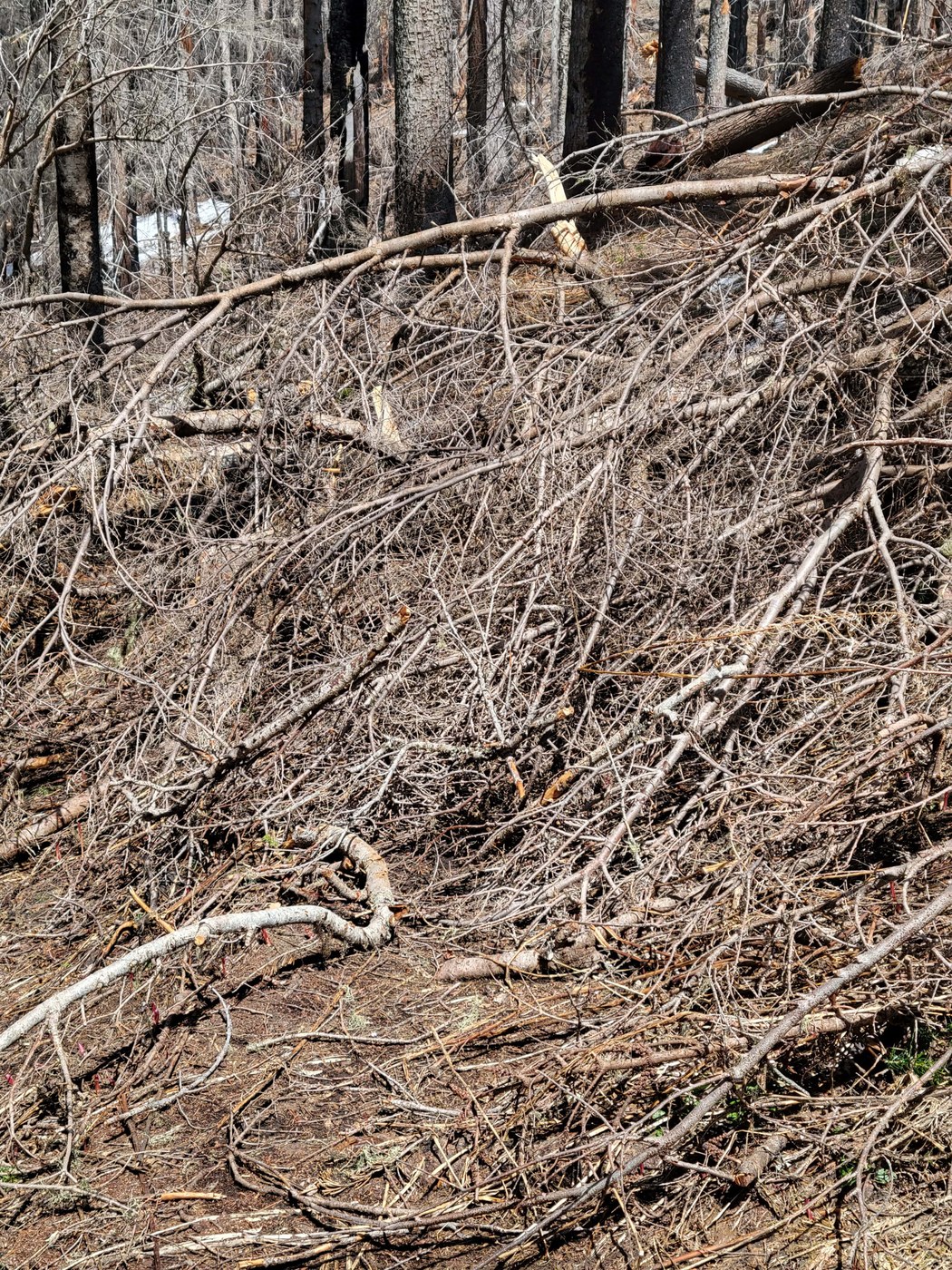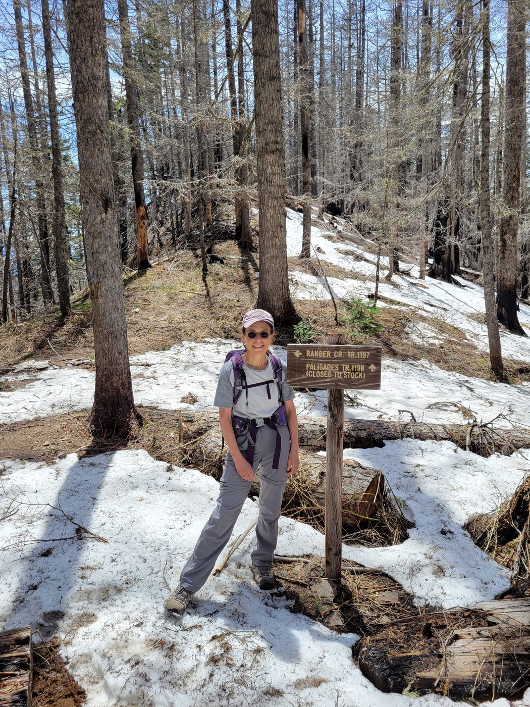 Thanks to the excellent May 22nd report by Bike-n-Hike, and comments by imadethisupforthis, we started today's hike with a good idea of where we might run into snow or other obstacles: circa the Little Ranger Peak/Palisades junction and some north-facing switchbacks. I am happy to report that the snow has nearly melted out, and that poles and careful footing were all that was needed in the few places where compact snow still lingers. The two places where there's still some minor snow are just beyond the junction (soft snow, see pic) and on a couple of north-facing switchbacks about 1.5 miles down Palisades (approx. 1 ft deep, compact)--well below the ridge. You can just walk atop it. More challenging is the "tanglewood" atop the ridge, within about 1/2 a mile of the junction (see pic), where dry, spindly, brushy downed trees necessitate some guerilla hiking tactics--creeping carefully through, so as not to poke your eyes out. All easy enough, just took a few extra minutes. (Unfortunately, we weren't carrying a little handsaw or pruning shears or anything). Otherwise, there are a few blowdowns along the circuit, all of the throw-your-legs-over variety.