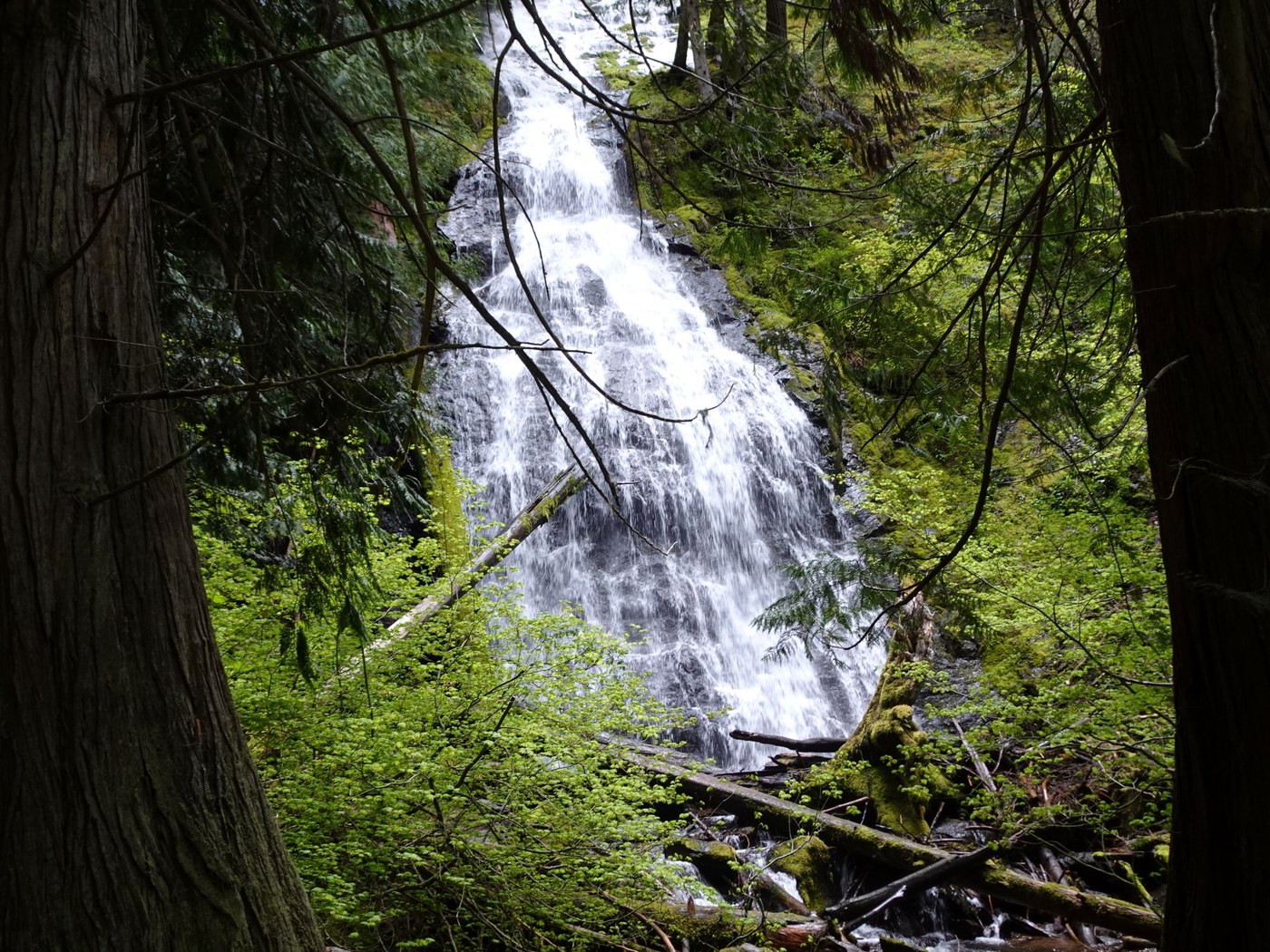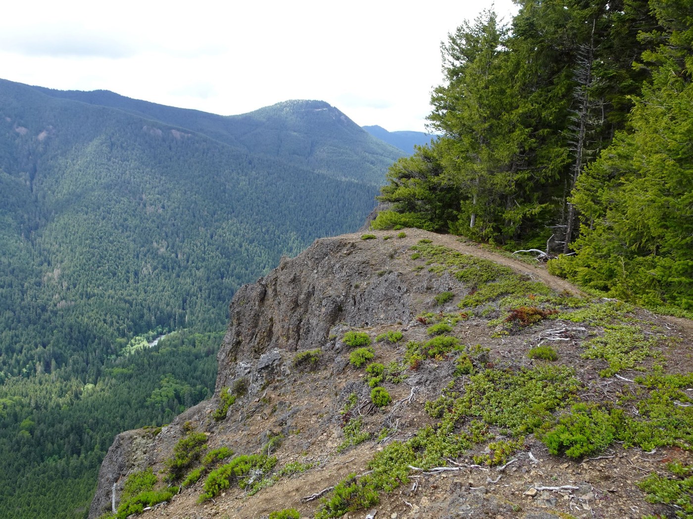 Another half mile up the trail is the base of Dalles Falls. The very short side trail is well worth the visit. Following the falls, continued on up to the stairs. Following the stairs and a few steep switch backs, I crossed the Dalles Creek on a 2 x 8 board.