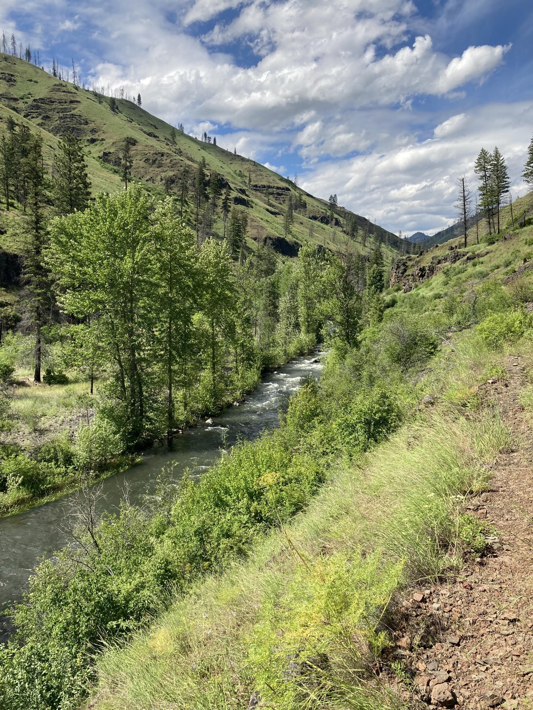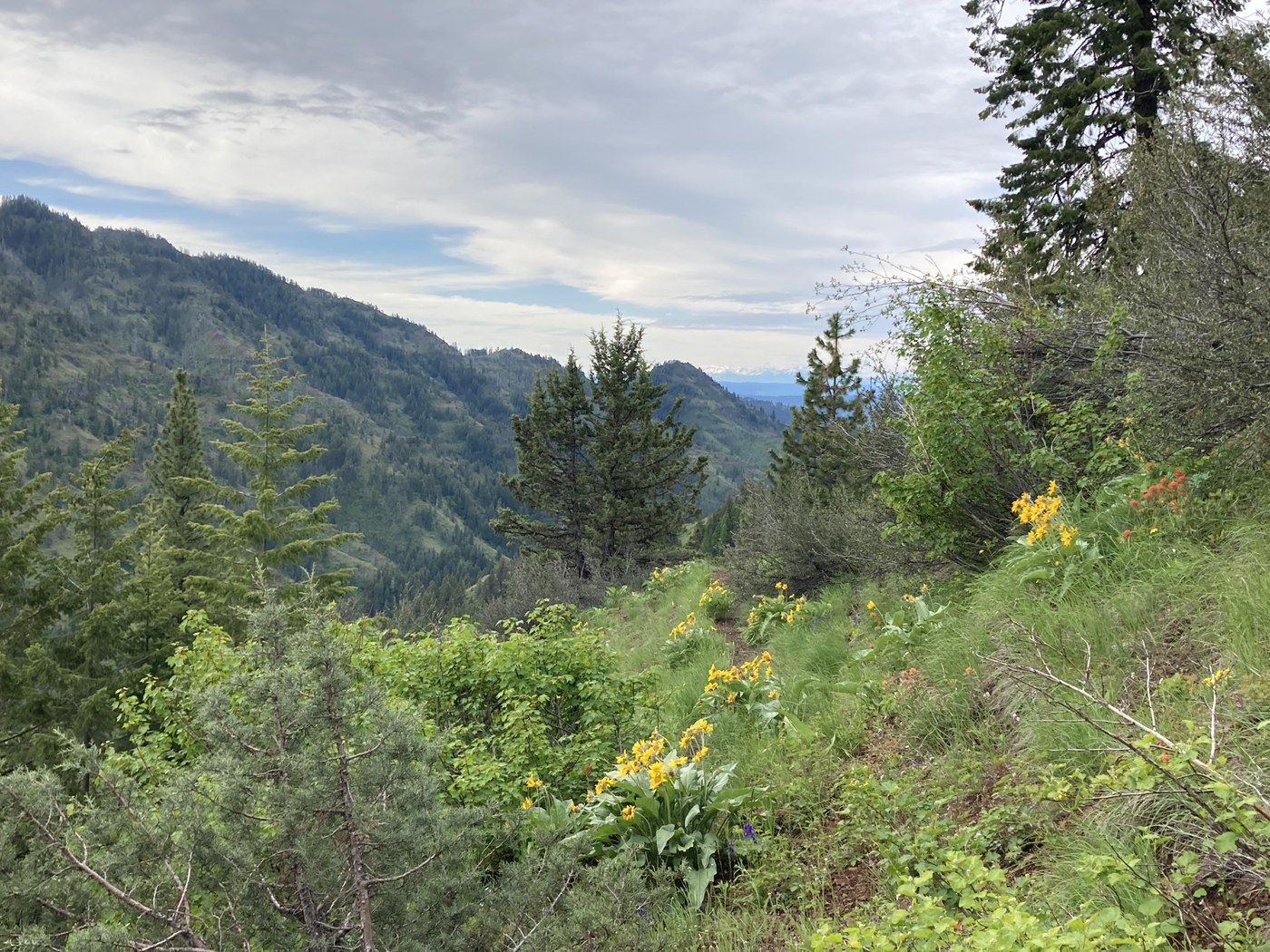 Route. Started at Panjab Trailhead (road was actually closed 2 miles before trailhead due to flood risk), then headed east on Mt Misery Trail to Diamond Peak. Turned south on Melton Creek trail, then Crooked Creek to Wenaha River. Up Smooth Ridge Trail from Fairview to Oregon Butte then back out Panjab Trail.