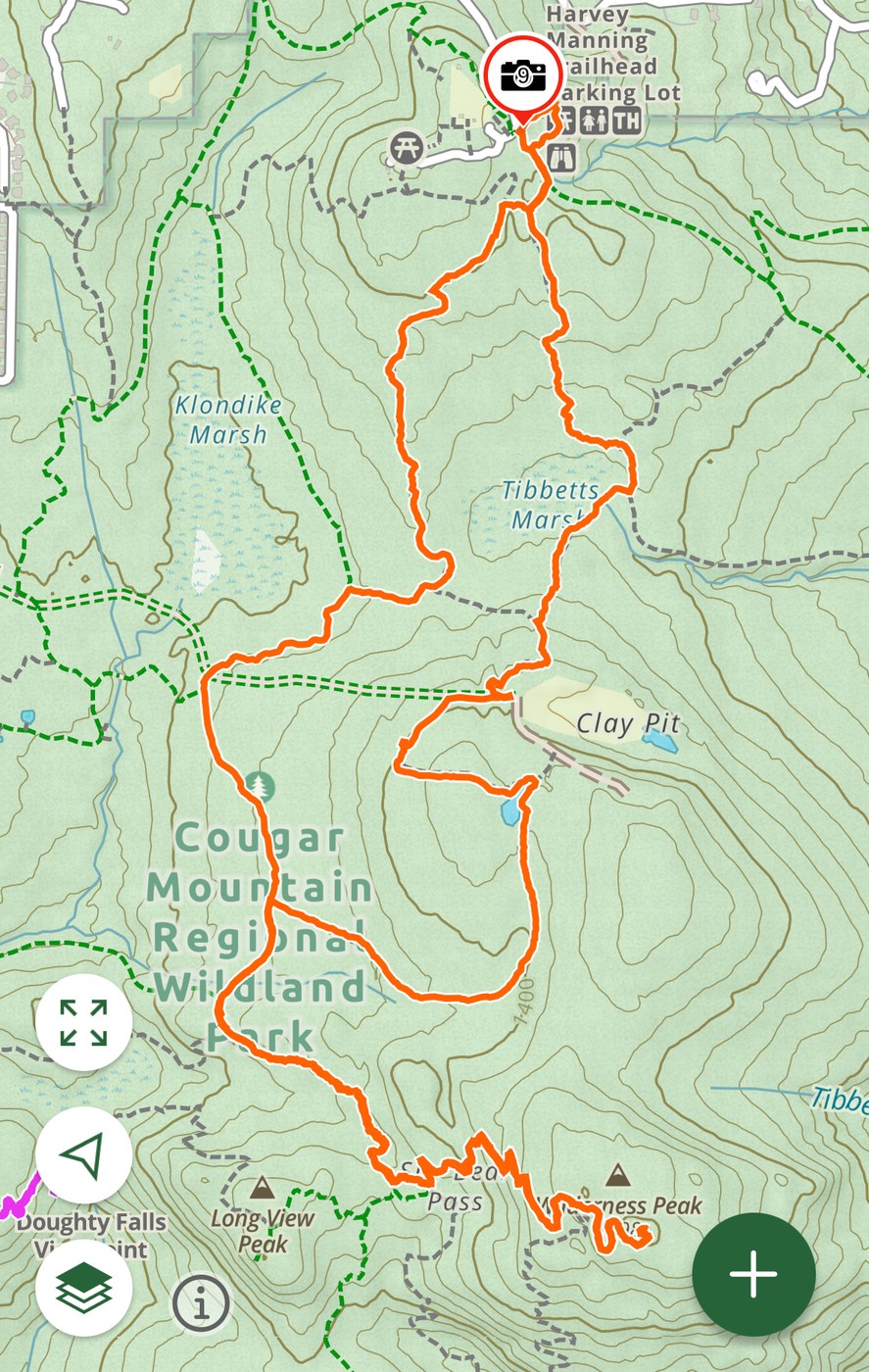 I arrived at the Harvey Manning trailhead around 11am and was one of two cars in the parking lot. It was a perfectly cool spring day for a spontaneous hike. I ended up doing a 6.6 mile loop; I'll show the map below. All trails I hiked on were in great condition, only one had a small alder tree across it that wasn't difficult to cross. Overall, I didn't notice too many invasive plants which brought me hope, but as I neared the top of Wilderness Peak, I started to see some English holly trees growing that would be easy to take out.