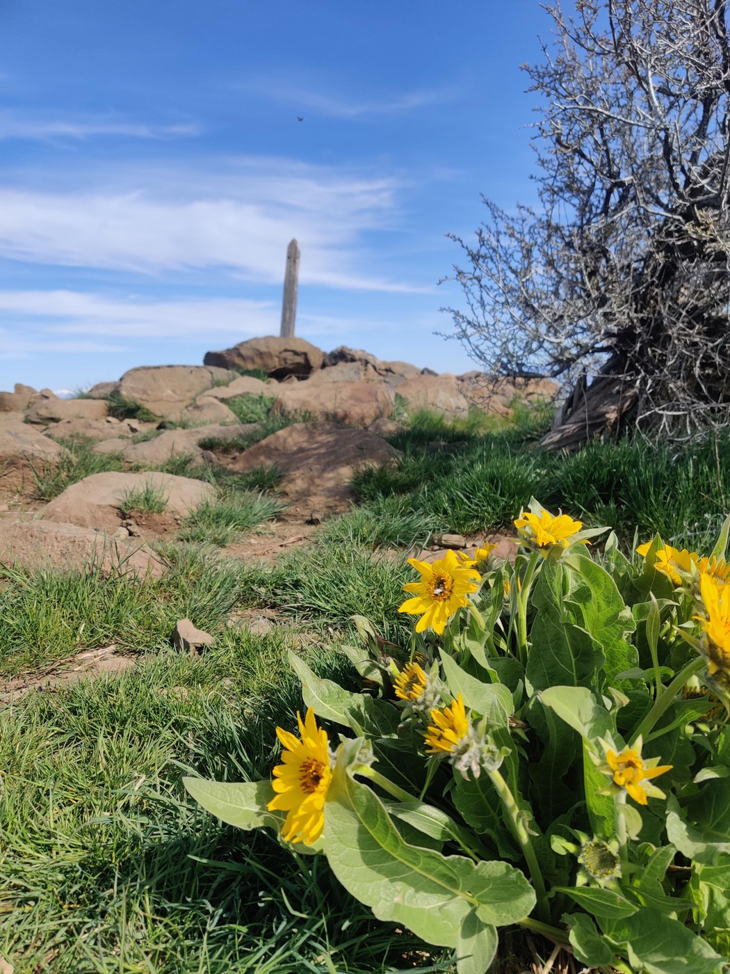 Arrived just past 9:30 on a sunny warm Saturday and saw around 15 other cars parked and more when I returned. Hiked up and ran back down - total time 59 minutes for 3.93 miles tracked. Some spots of loose rock require a slower pace but overall excellent trail conditions. Various low wildflowers are in bloom as well as the larger balsamroot currently. Cannot be emphasized enough that 95% of this trail is entirely exposed so water and sunscreen are imperative.