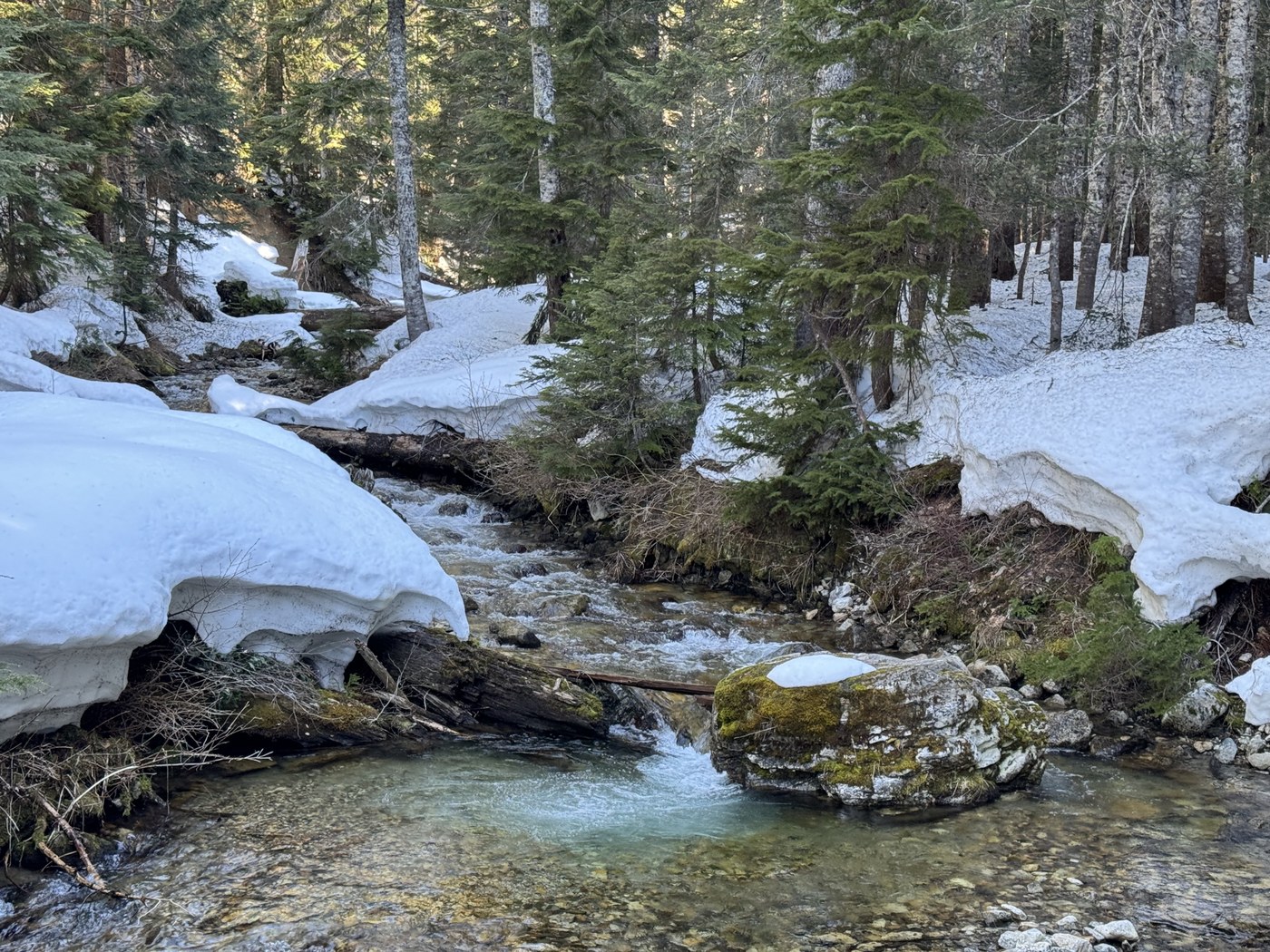 FR 6530 has potholes but it is no problem for any car to make it to the trailhead. Lower trail has a lot of branches on the trail with 4 or 5 small blown down trees but these don't present as large obstacles. Snow completely covers the trail starting at ~3100ft about 1.75miles into the hike. There is boot track for a short distance but then disappears into open meadows. Rather than trying to follow a route along the buried trail on steep slopes I opted to snowshoe along Meadow Creek. Would probably have been possible to walk without snowshoes on the consolidated snow but the snowshoes helped for traction and avoiding punching through. Route was pleasant with a mix of open old growth forest and meadows along the creek. Eventually the valley narrowed and it would have been difficult to continue on without crossing the creek so opted to turn around 3 miles from the trailhead. There is still 3 or 4 feet of snow on the ground in the valley above 3100 feet.