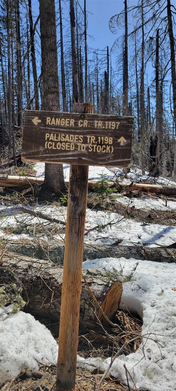 Started this hike from the Coral Pass Road, FS 7174, where the gate is currently closed for uphill travel. Followed the White river Trail until the junction with the Little Ranger Peak trail. Followed this trail to the top, Dalles Ridge, and returned same way. White River Trail mostly in good shape with a few minor areas of where the trail has sloughed off leaving a short section of narrow trail. The Little Ranger Peak trail is mostly in good shape at least to the viewpoint at about half way up. The trail from here has multiple tress down across the trail, which all but one is almost of no consequence. There is one spot with several small trees down that takes a little effort to get through, but really isn't much of a problem. Up near the end there is one switchback where a tree has fallen and really messed up that corner, its a little slippery going up, and even more so coming down. At the top there was light covering of snow pretty which along with numerous limbs etc., made seeing the Palisades trail very difficult.