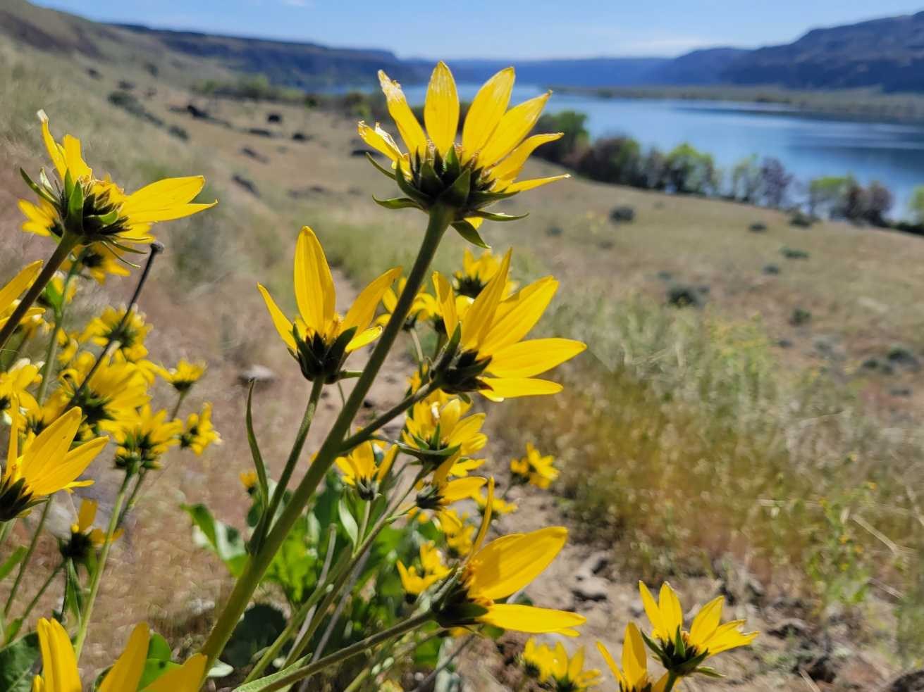 Got up very early to make it to the lower trailhead by 8 am. Plenty cold in the shade but the sun was welcome and soon overhead. We found a campsite overlooking the lakes pretty easily, watched for a bit as many other folks made there way into the basin. Decided to hike down to the Ancient lake falls, then around to the south side. There were plenty of birds to spot; Canada geese, mallards, red-winged blackbirds, white-crowned sparrows (everywhere), swallows, a red-tailed hawk, crows, ravens, and even a couple bald eagles. Made it up to the bluff with plenty of stops to admire wildflowers, and spotted a couple marmots along the way. We checked out both viewpoints before descending back down, so glad to have poles for that descent! We napped in a shady spot by a big rock, then continued down the Potholes coulee to the Columbia river. So many lovely wildflowers along the way! After a long rest and foot soak in the river, we hiked back up to our campsite, about 10 miles all told. After another rest, we enjoyed dinner and views. There were many more tents in the basin, but I don't think all the campsites were full. We saw many fires, even though signs at the entrance clearly state no campfires were allowed. The wind kicked up after sunset and blew pretty good most of the night. They only calmed down just before sunrise. We slept in, enjoyed breakfast and then hiked out. Stopped in Quincy before the long slog home.