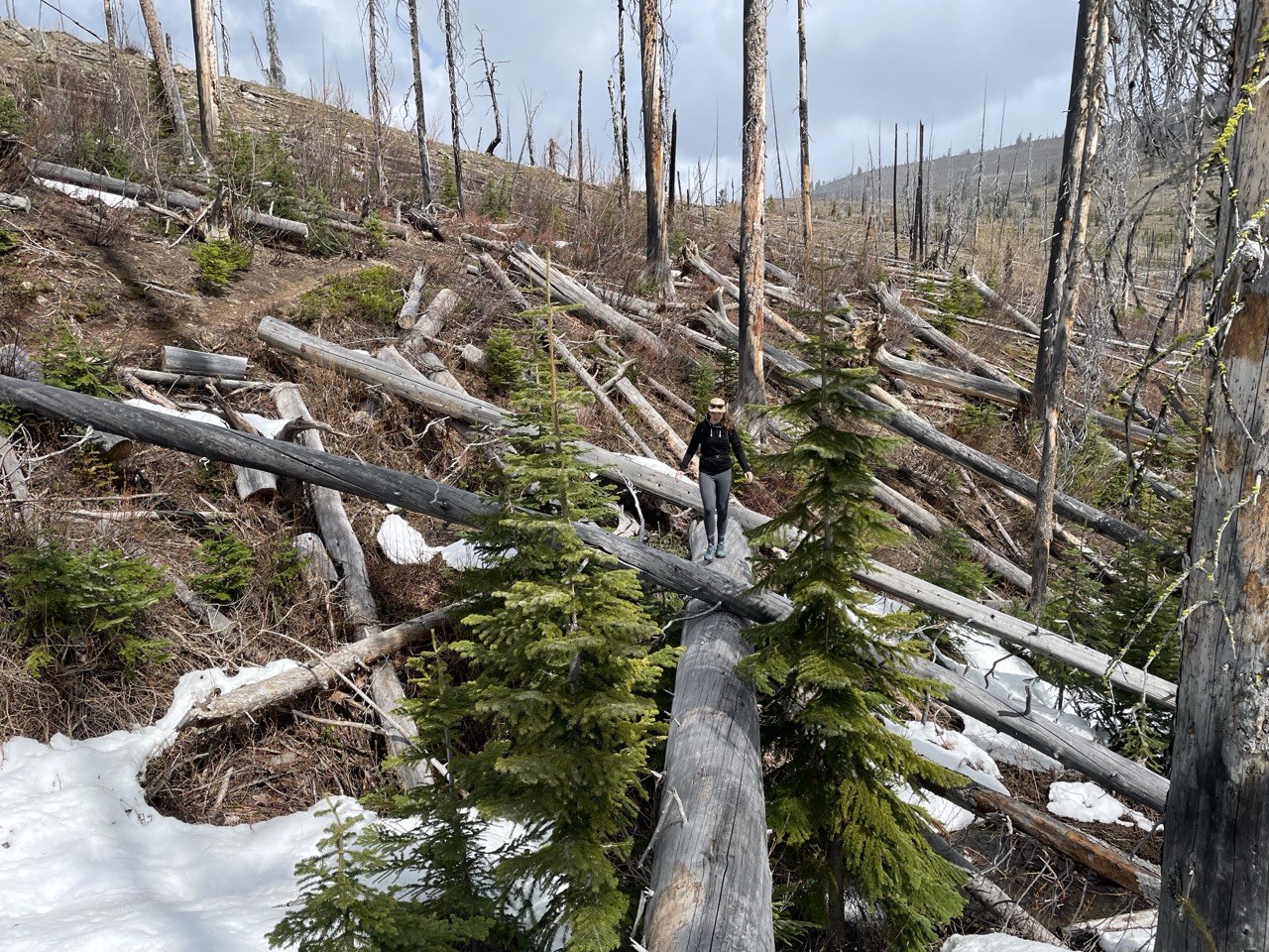 After you pass the first turn off at roughly 2 miles, the trail levels out, but now you are crossing snow, muddy sections, and streams, using downed logs.
