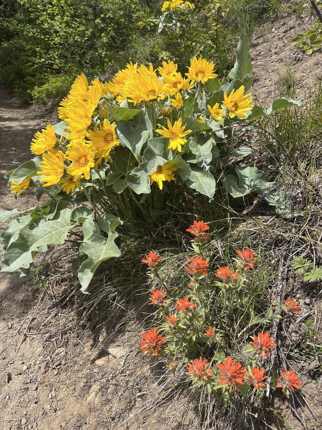 Wildflowers are in prime! Arrowleaf balsam root, paintbrush, Oregon grape and Saskatoon are full on blooming. Lupine is coming in, and I also spotted trillium, glacier lily, phlox, larkspur, ballhead waterleaf, blue penstemon and more. What a delight! Not a ton of parking but we still got a spot at 10:15am. We parked below the creek crossing- it’s very shallow but muddy. Sure there were a good handful of folks on the trail, but it didn’t feel overcrowded to me like I read in some other trip reports. Lots of cute doggos!