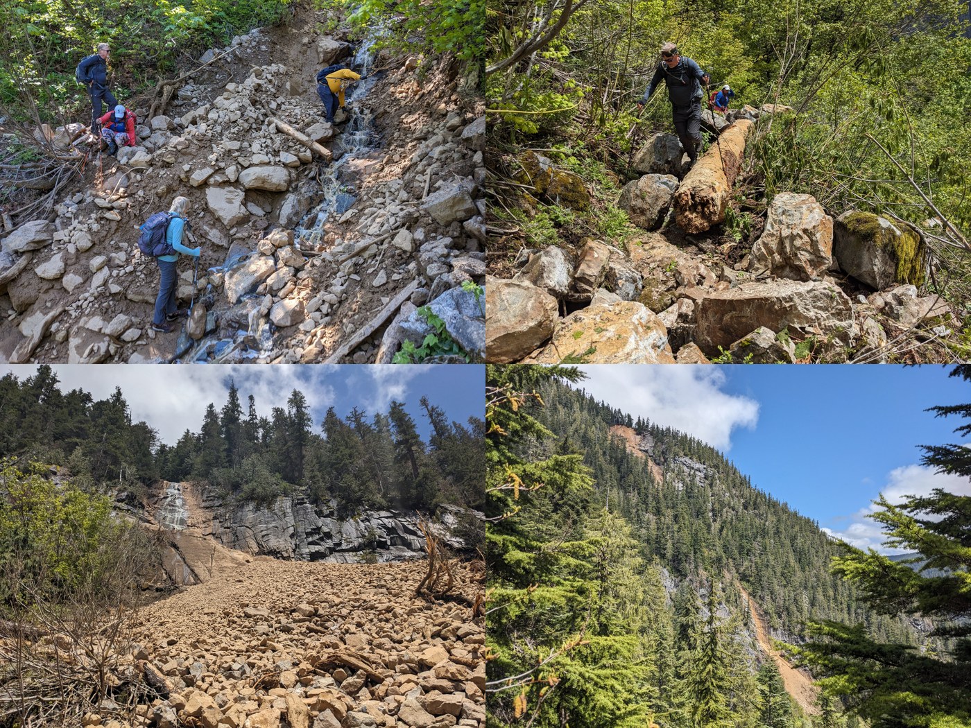 Crossing the debris flow path over the trail is a bit sketchy, but it seems stable enough for now, and will likely get more stable as things dry out a bit. I moved many of the loose rocks down into the creek to make the crossing safer, but more work will need to be done here with some real trail tools to put in a better, flatter route. For now, I recommend the “low route” which descends about 10’ from the trail level to the creek, then back up the other side. The mud can be slippery, so poles will help and you may want to kick in some steps along the way.