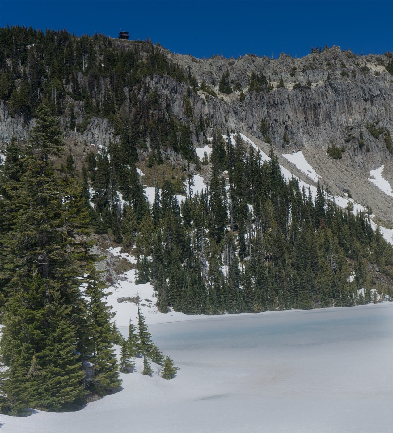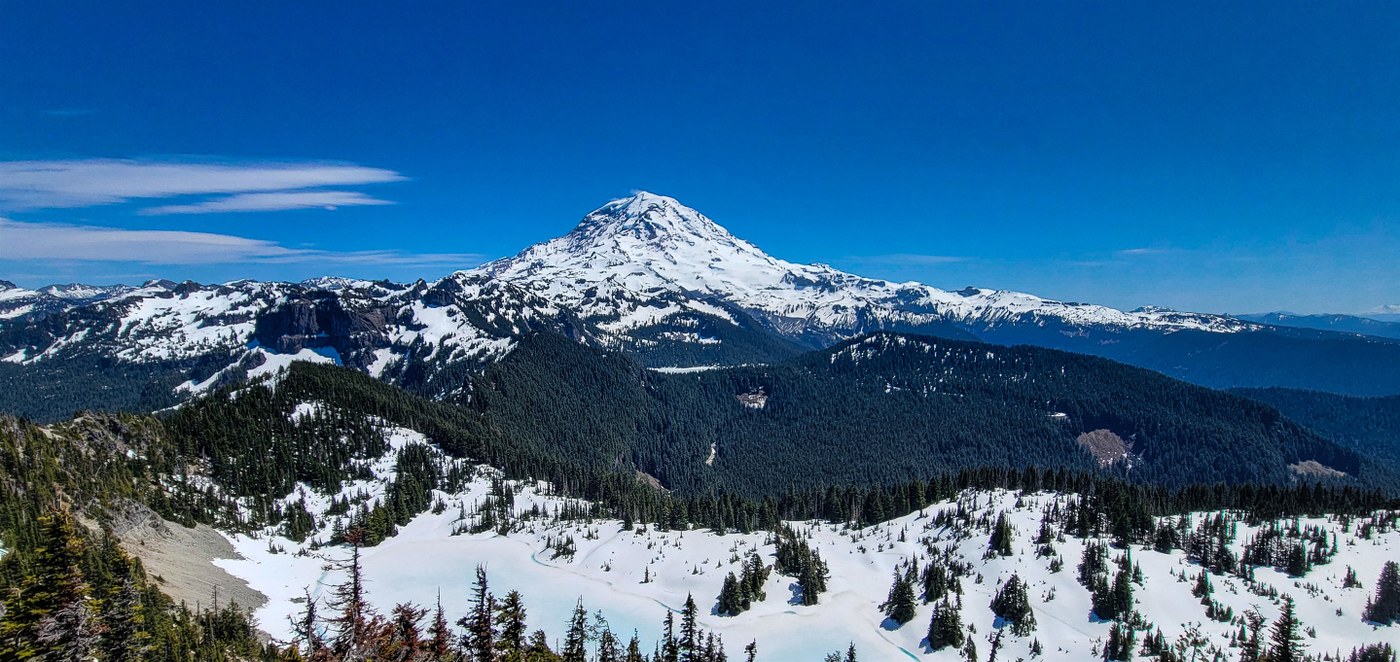 Mowich Lake road closed at the gate by the Paul Peak trailhead. The road was snow free until about the start of the Grindstone trail. There are several feet of snow and Eunice Lake, where soft snow resulted in semi-difficult travel. The trail from the lake up to Tolmie Ridge was mostly snow covered, so on way up mostly just went straight up to the top of the ridge, however on way down, tried to follow path more and there were some melted out sections. I think that trying to follow the path up would have been easier than the route I took. It was a beautiful clear day with only a mild wind at the lookout. Was able to see Mt. St Helens, Mount Stuart, and Glacier Peak in addition to Mt. Rainier. Eunice Lake is in the process of melting out with some obvious blue border and a good section of a blue color in parts of the middle of the lake.