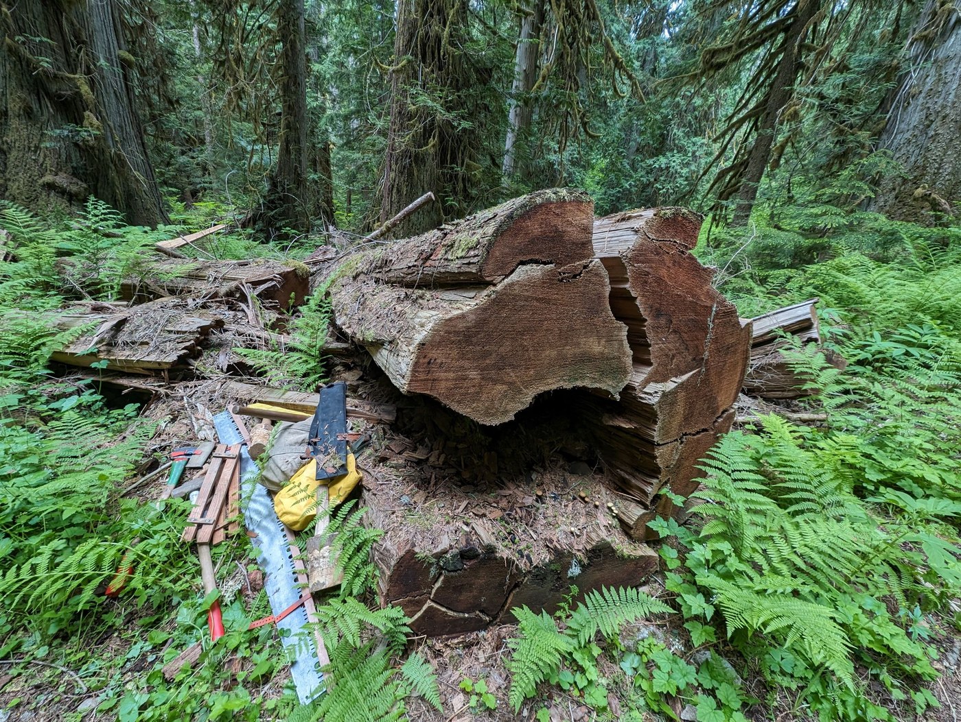 Beautiful day to be out amongst giants. Our trail crew hiked in a mile on the North Fork Sauk River Trail. There are a few trees to work around but not challenging. We split up into two teams: One worked on rebuilding a rock retaining wall at a creek washout and our team backtracked to saw out some 4 x 6 from a dead fall tree for a future puncheon project. Good leadership and great volunteers made the day go quickly. Someday I'd like to come back and hike out further on this beautiful trail.