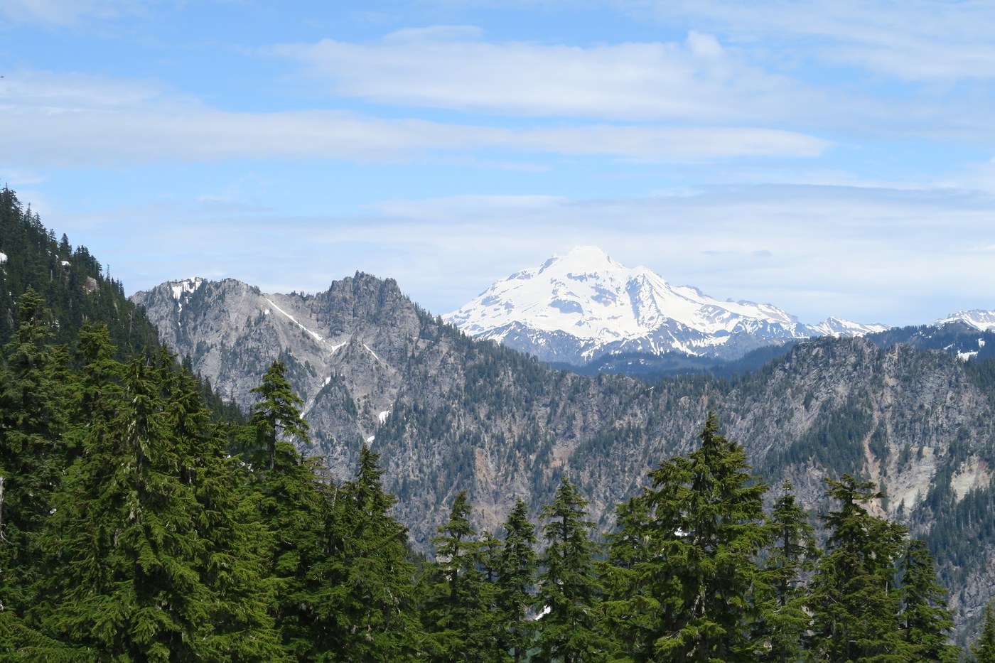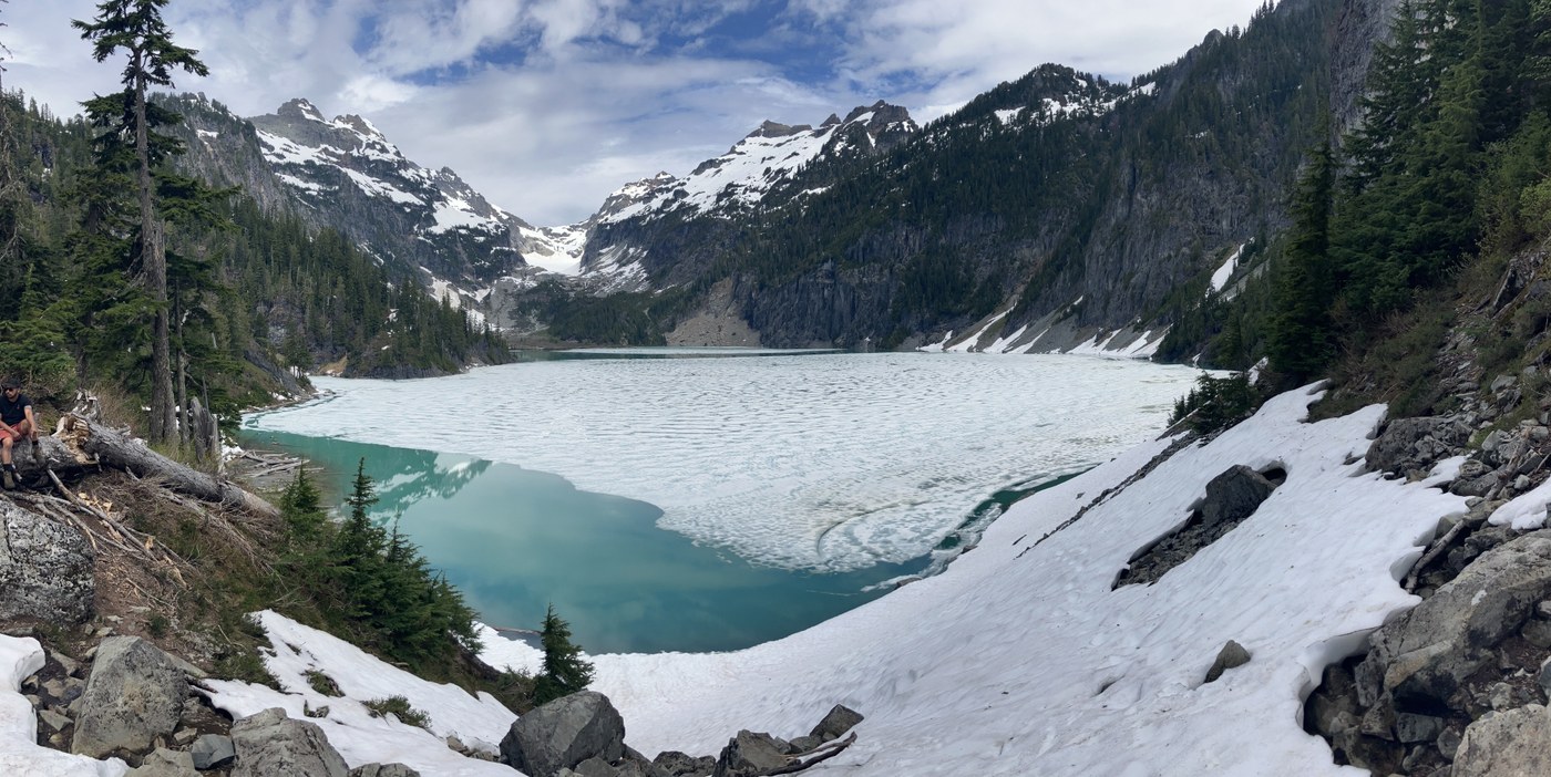 The trail had half a dozen blow downs in the bottom 1000', but none after that. We hit solid snow about 200' below the pass and we transitioned from following the trail to following footprints in the snow. It was a warm day, so the snow was relatively soft and consolidated which limited post-holing, but we still had to watch out for places where you could break thru especially near the edges of the melt. I am guessing we deviated from the official route just a bit near the top to stay off some of the steeper snow-covered terrain. Surprisingly, once you start heading down towards Blanca Lake from near Virgin Lake the snow dissipates fairly quickly, and I removed my micro spikes for most of the decent. There was also solid snow right above the shore of Blanca Lake, but I am guessing about two more weeks will allow enough snowmelt to follow the trail all of the way in with only limited snow patches remaining to cross after that.