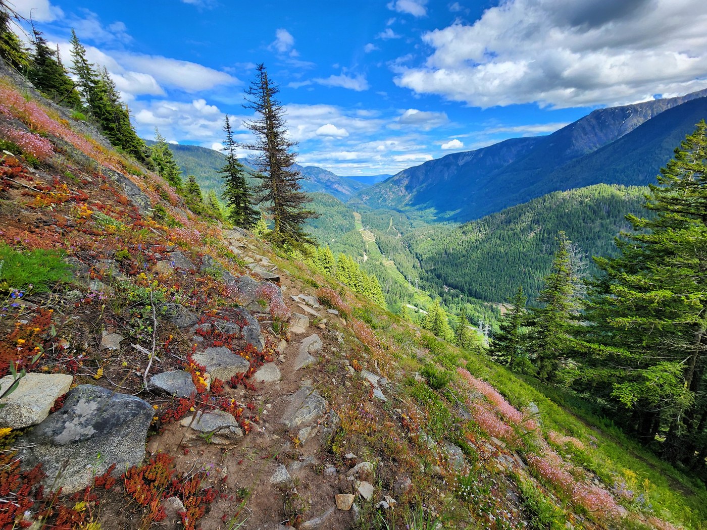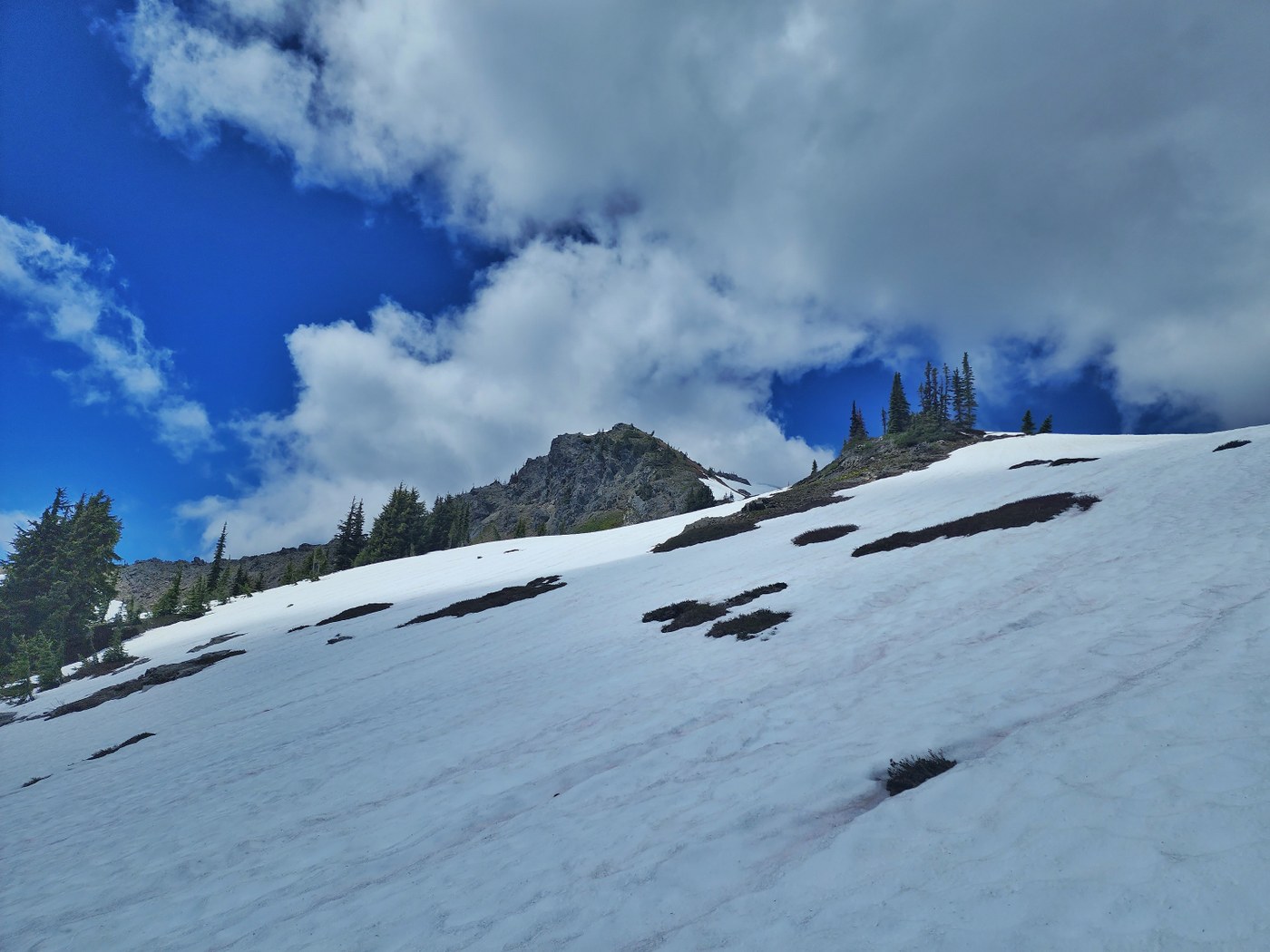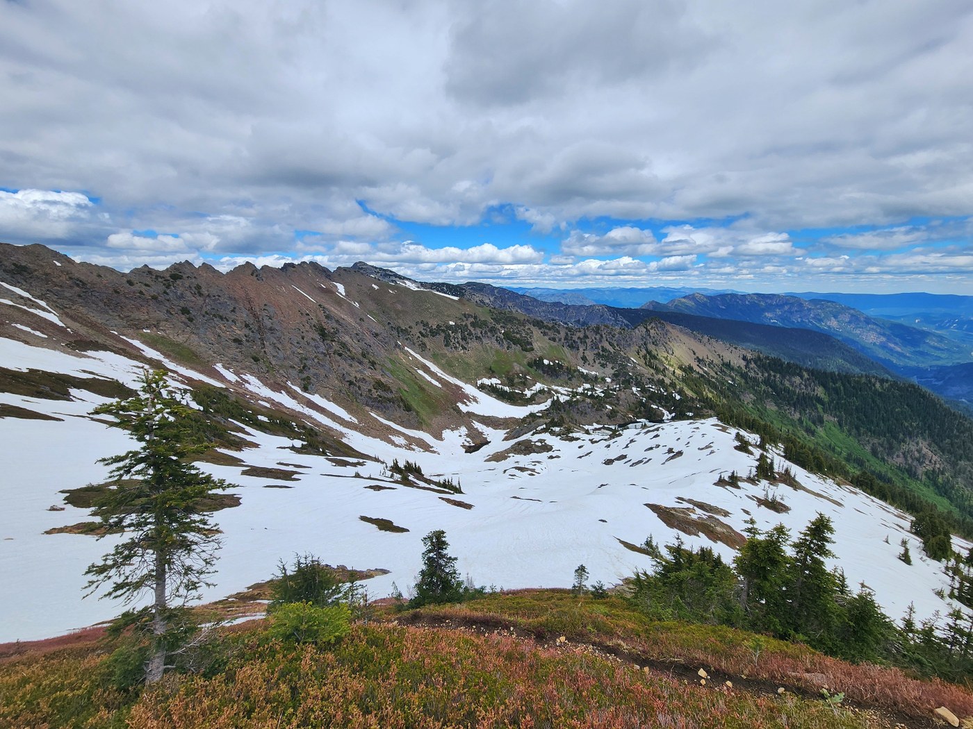 Started at around 10 AM which was super late considering this trail was mostly exposed to the sun. Trail was mostly dry, a bit brushy in places and I counted 3 old blowdowns to go over and under. Lots of wildflowers bloomed along the trail. It was scorching hot to the point that I was exhausted and almost finished my 3L water when I was above the treeline. Those 90ish switchbacks felt like switchbacks inferno.