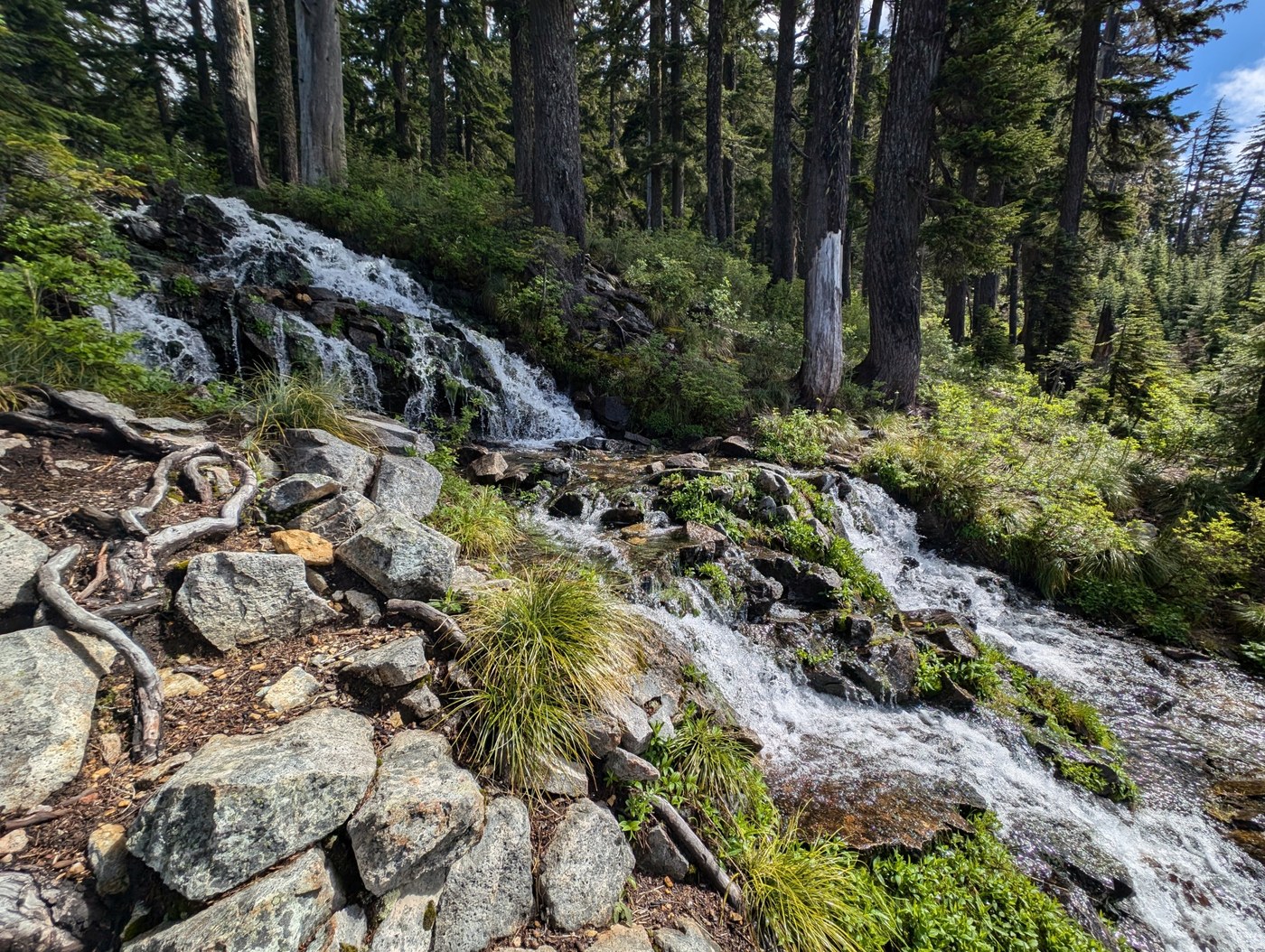Lakes are ice free, and the waterfall past Mirror Lake is running high. Beargrass is just approaching peak; I'd say it will start to fade in a week or so, but should be great for the Fourth of July weekend. Scattered other wildflowers are starting to come out, but it seems still pretty early for flowers.