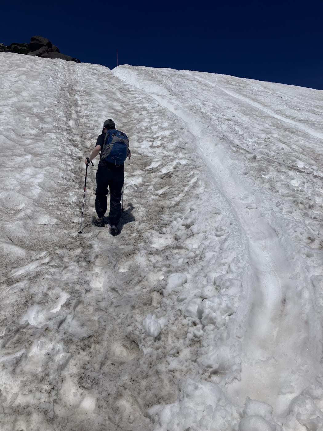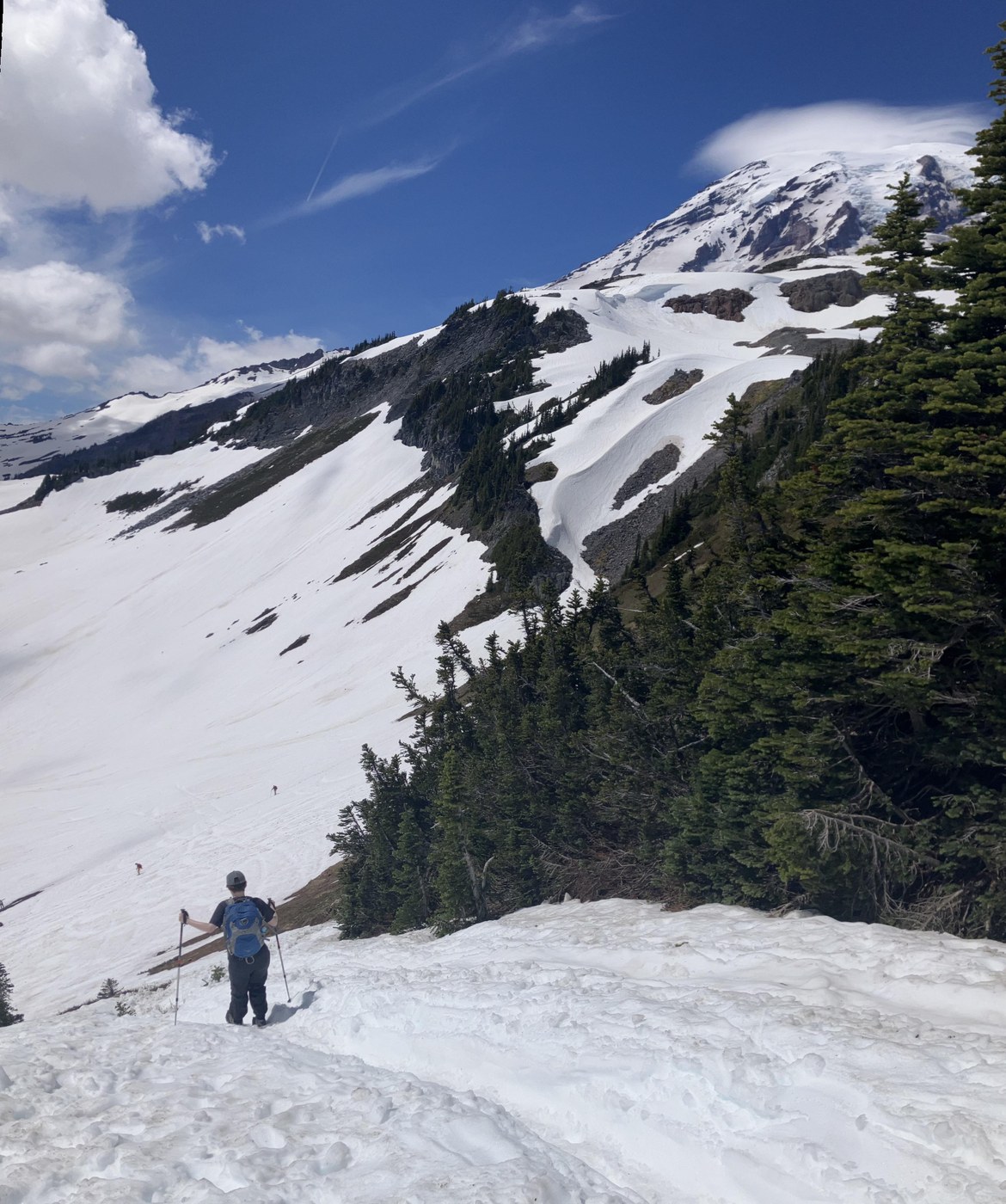 After making it to Panorama Point with no issues and having gotten some encouragement from other parties, we decided to continue on the Skyline Trail. Things definitely got rougher beyond Panorama Point – we encountered steeper climbs and descents, plus some sections where glissading was all but necessary. That being said, we have very minimal snow travel experience and still had an excellent time! At no point did we feel scared or unsafe. Some parts of the trail are melted out, but most of it is still snow-covered. The route also was not marked past Panorama Point, though there was almost always a boot trail to follow. When there wasn't, I used my phone's GPS and some downloaded maps to navigate and had no problems.