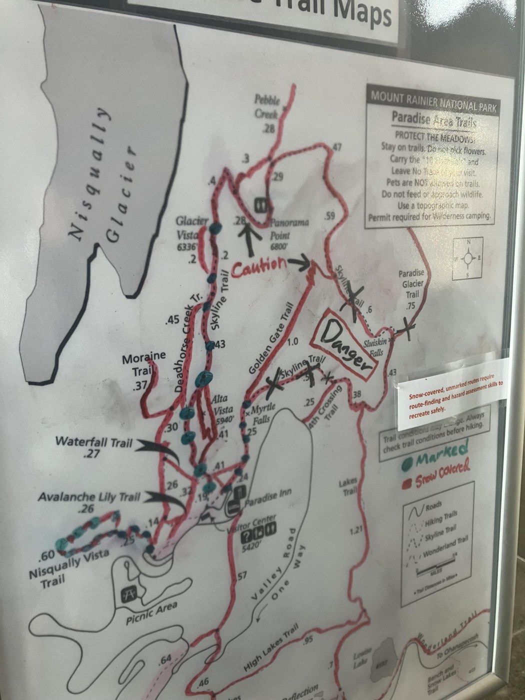 The park representative stationed by the map outside the visitor's center was giving tips about current conditions. We were originally only planning on going to Panorama Point, so that's what we asked about. Because we told them we had spikes and poles, they let us know that we'd have no problem. That being said, they said they weren't encouraging people to do the whole Skyline trail at the time. Sure enough, in the visitor's center was a map outlining "Danger!" zones past the intersection with the Golden Gate trail (see attached photos).