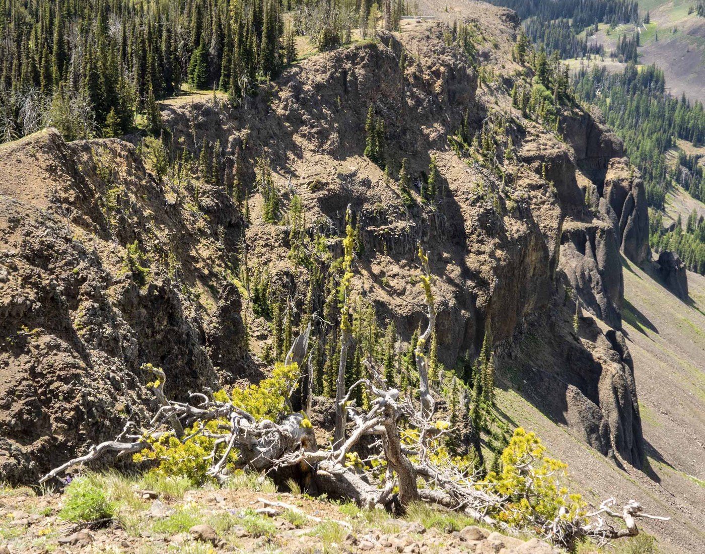 Ethan & I drove up to Eagle's Nest and then hiked east out Whites Ridge. They have been making improvements to the Eagle's Nest day-use area and viewpoint. Last year they put in a 3' high wall at the viewpoint and this year they have put in an accessible trail from the parking area to the viewpoint. The day-use area is still closed because they are not done with the work, but the outhouse is open and stocked with TP. We parked beside the road and walked to the viewpoint and then about 1.5 miles out Whites Ridge to a nice high point with views of Darland Mtn and the whole upper watershed of the North Fork of Ahtanum Creek. Mt Rainier was hidden in the clouds. There were lots of wildflowers. At the beginning the buckwheat was profuse and farther along it was groundsel and then Thompson's paintbrush. At one point we saw quite a bit of Whitestem frasera (Frasera albicaulis) and then at the top we saw Giant frasera (Frasera speciosa), also known as Monument Plant or Elkweed. We were followed game/boot trails or just made our way along the crest of the ridge. Much of the route was rocky, which made for slower going (the minor obstacles). We didn't see any other hikers and no wildlife except for a few birds. The day was mostly sunny and warm when it was calm and cool when the wind was blowing.