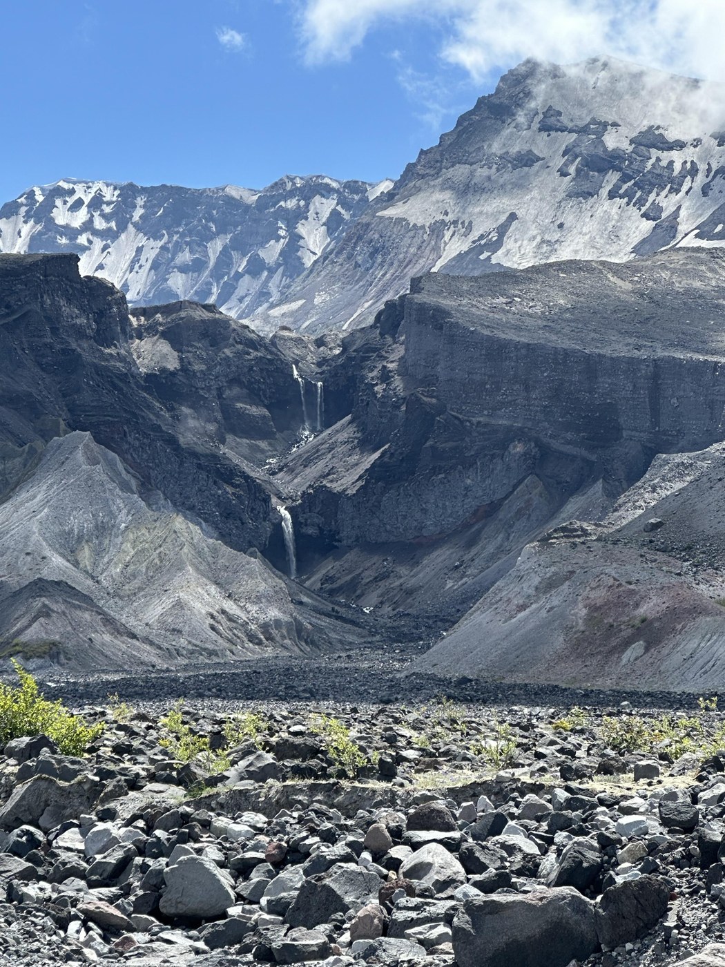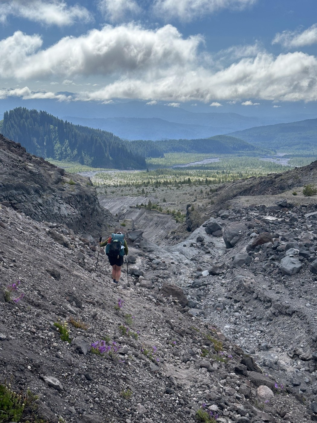 Right now, there is water in the blast zone starting at about mile 6 for this section. It is a big water crossing due to some waterfalls coming off of the crater. There were two streams. We couldn't find rocks that we were comfortable navigating to get across the second section, so we walked up stream where we found a place where we could wade through about mid-thigh. It was a little scary, exhilarating, and honestly, the cold water was refreshing after hiking in the sun. We stopped for lunch and pictures then made our way toward Windy Pass.