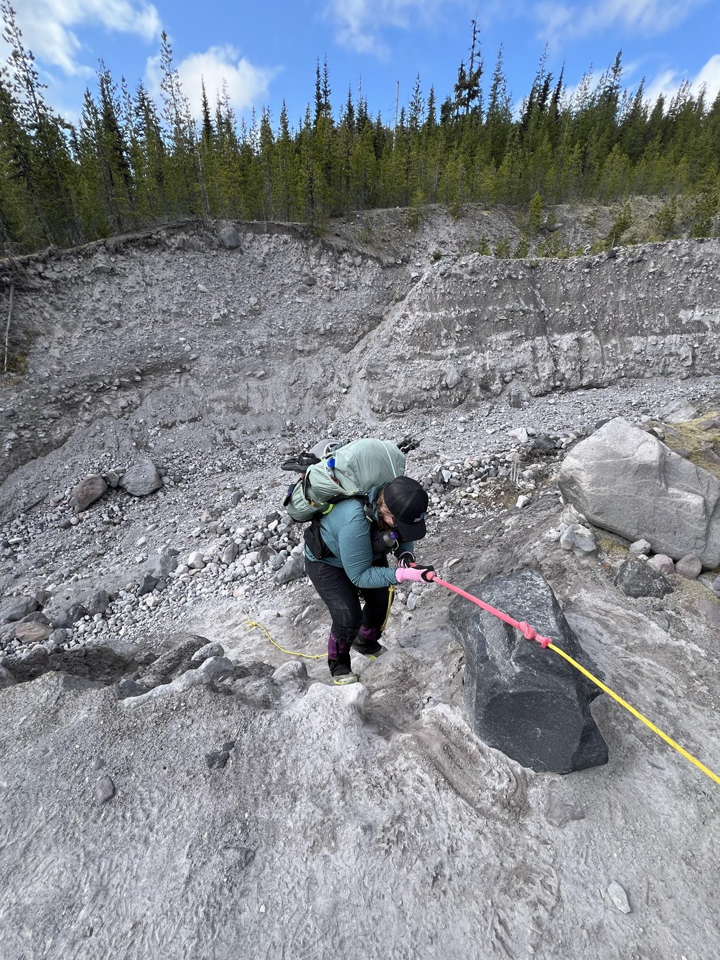We headed down the trail to find another boulder field before we found smooth sailing trail...well, sort of. There were some steep scree sections where it is hard to see the trail and felt a little treacherous. We didn't realize that this was a warm up for what we'd experience later. At 5:30 pm around mile 8 we reached the first set of ropes to get through a vast gully. We paused, sipped some water, and then slowly made our way. We both had some grippy garden gloves which definitely helped. It took about 30 minutes for both of us to get down and back up. From there we had about a mile of mild incline and then the last three miles were mostly downhill. We were thankful to see the Toutle River around 8 pm which requires navigating another rope to get down to the river to collect water.