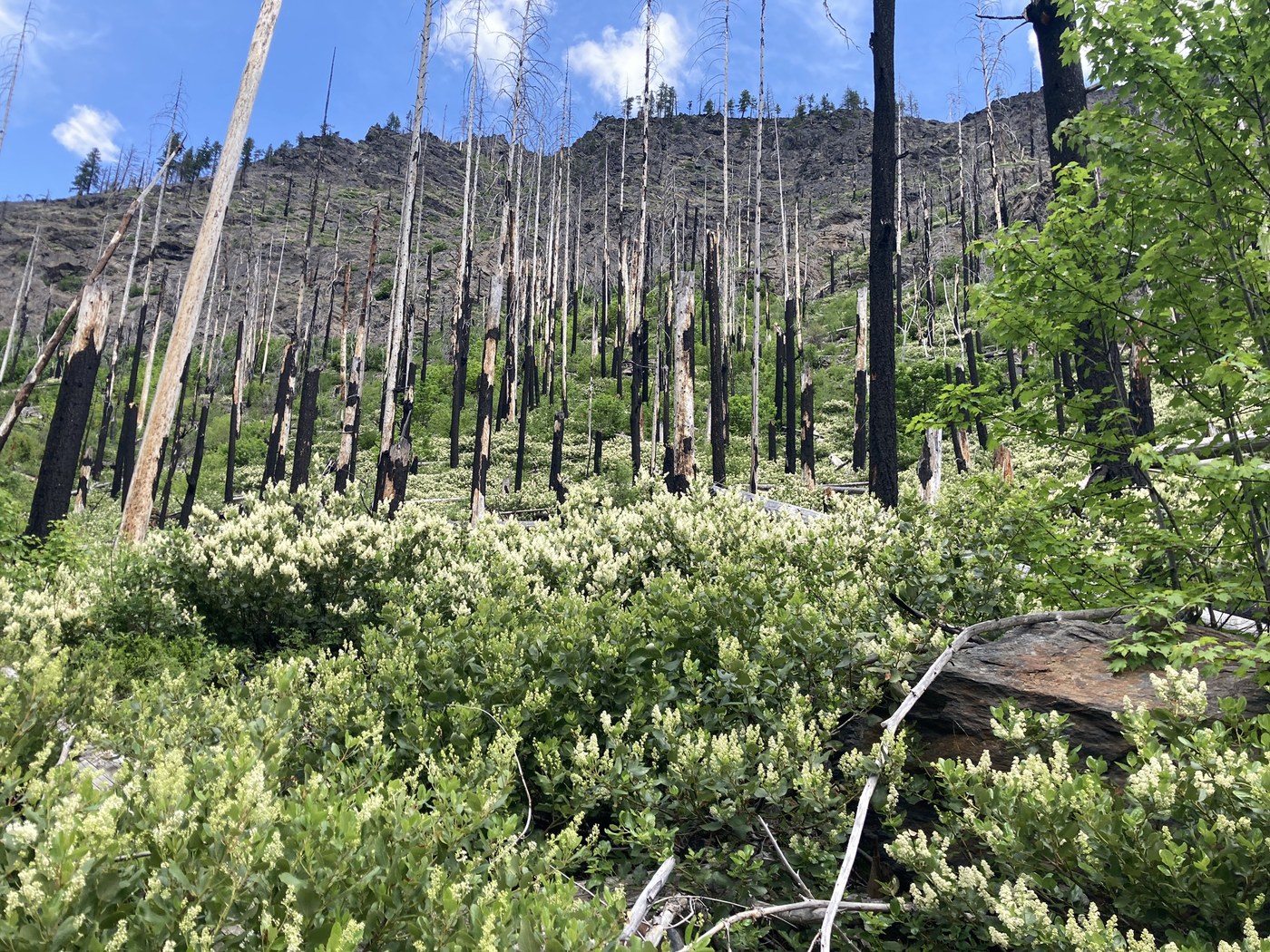 We went two miles in, some ways past the wilderness boundary. After the boundary there were many sections where we were walking through brush taller than me with little trail visible. I was glad to have long pants, though it did get warm and there isn’t much shade. We stopped to eat lunch at a point where the trail was down close to the creek — no shade but a cool breeze off the water kept it pleasant.