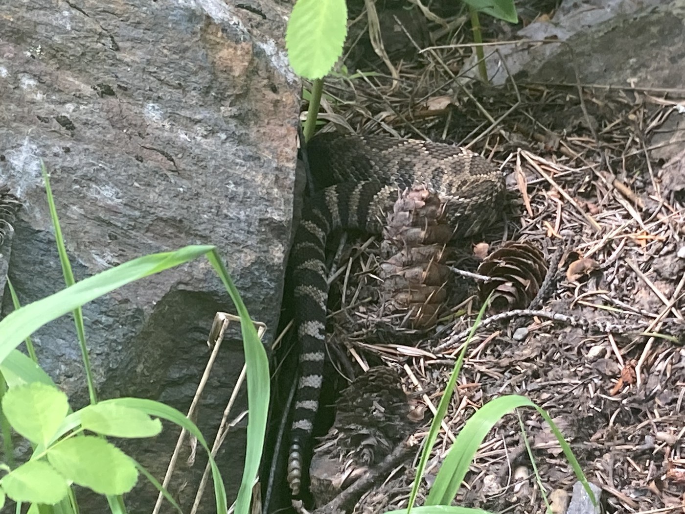 Note of warning: on the road shortly before the wilderness boundary, my kids were walking about 15 feet in front of me and started to scream. A large rattlesnake was crossing the road right in front of them, rattling. They ran back to the others and I managed to snap a photo as it crawled into a pile of rocks on the creek side of the trail. We were extra cautious after that. It didn’t appear on the return trip.
