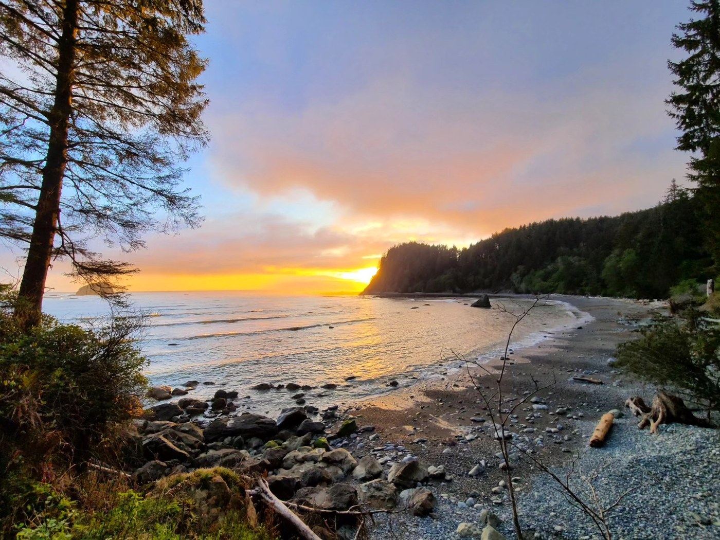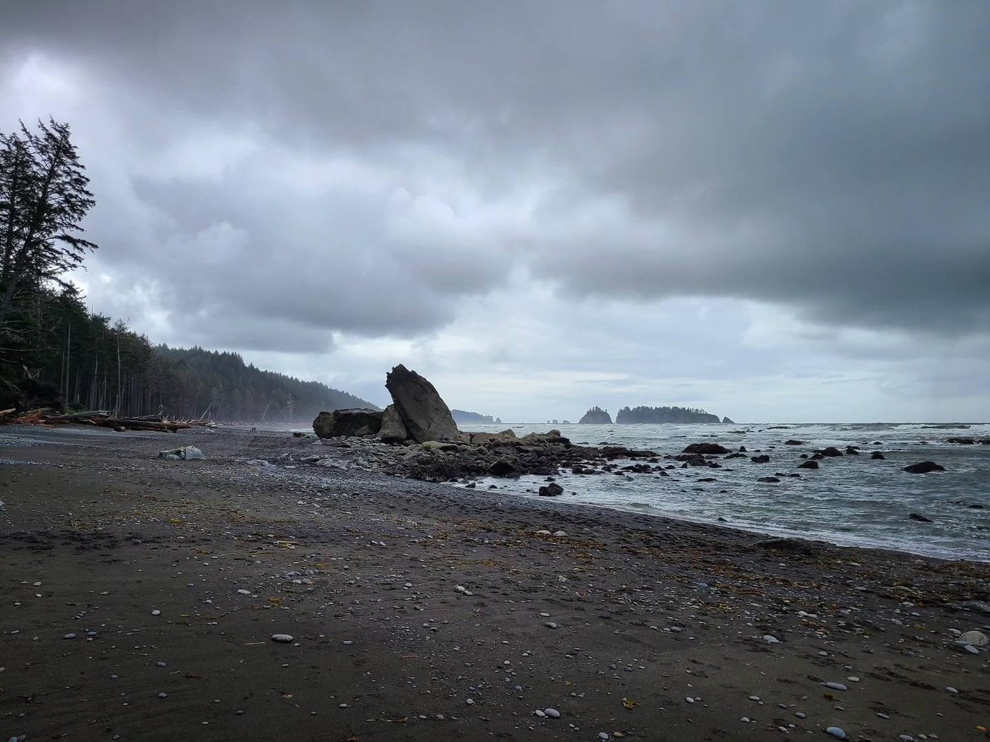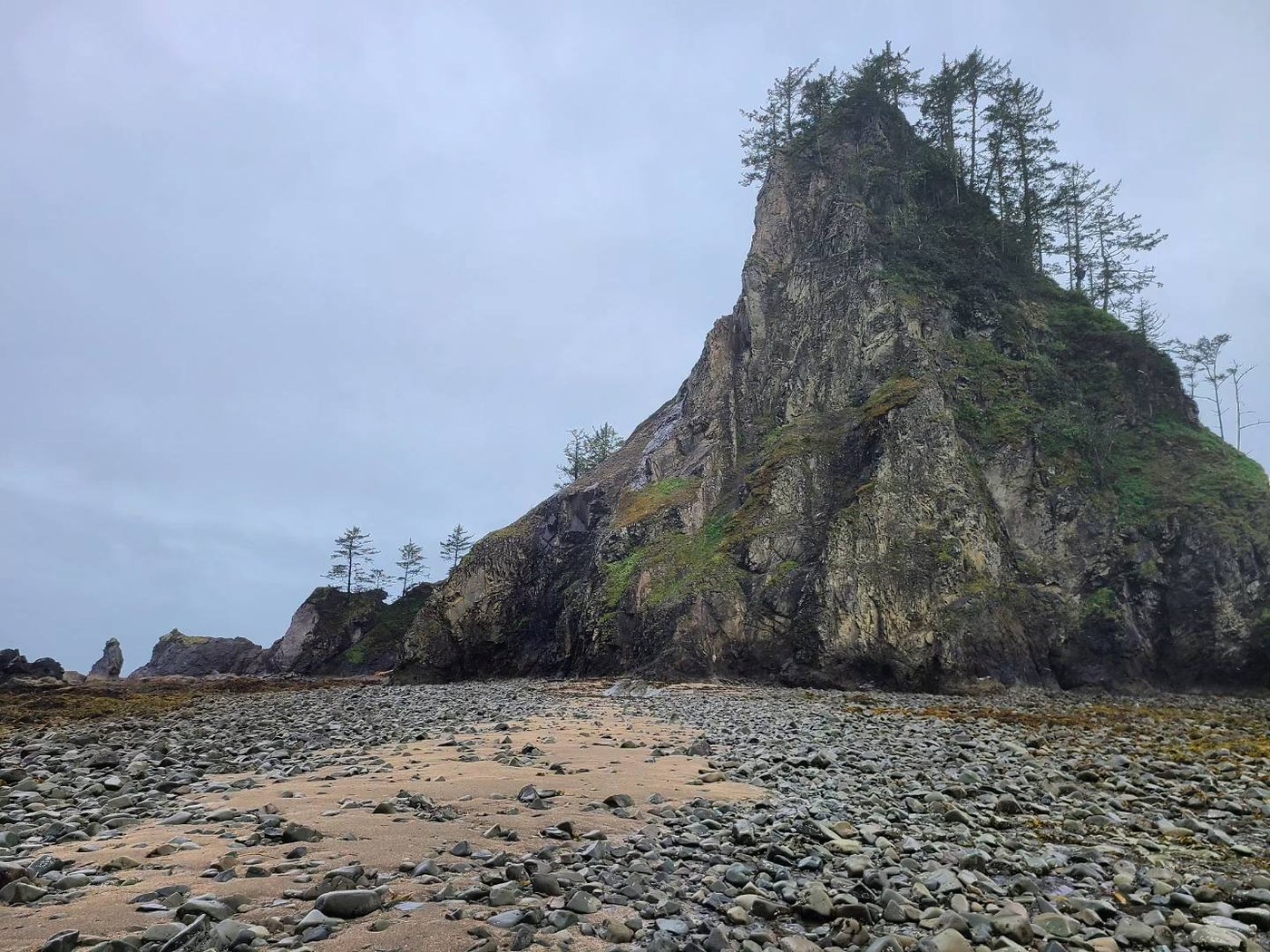 Two-night backpack at Chilean Memorial hiking in and out from Rialto Beach. Day one, arrived early to hike all the way to Chilean Memorial before tide came in mid-afternoon. Due to tide chart, we opted to camp on the bluff overlooking Chilean Memorial from the south rather than down on the beach itself. Day two was a bit windy/a little rainy, we explored low tide in the cove and across the land bridge out to the pointy stack island on its south end. Day three we got packed just before the rain arrived and made our way out as the tide went out that morning.