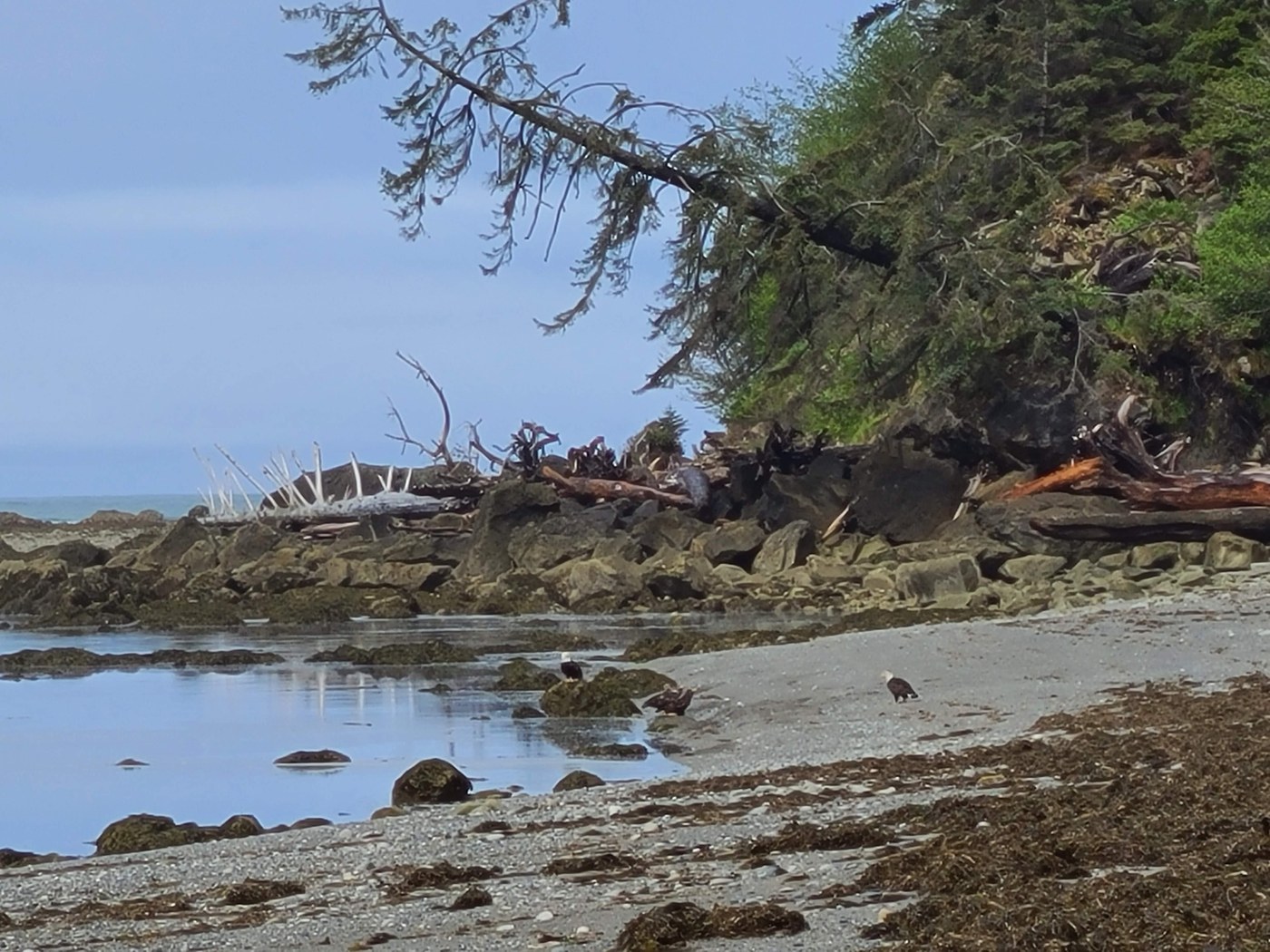 Lots of tidal life (chitin, sea stars, anemone, mussels, crabs, little fish) when exposed. Most impressive wildlife encounter was a group of seven (7!) Bald Eagles--some mature and several juvenile--congregating in one spot on the beach shortly before coming around the final head. I didn't know they did that! I got a picture of several of them, but two had flown off before I was close enough. Also raven, crow, and oystercatcher. Did encounter a large bear scat near the final head before Chilean Memorial, but no other sign of a bear.