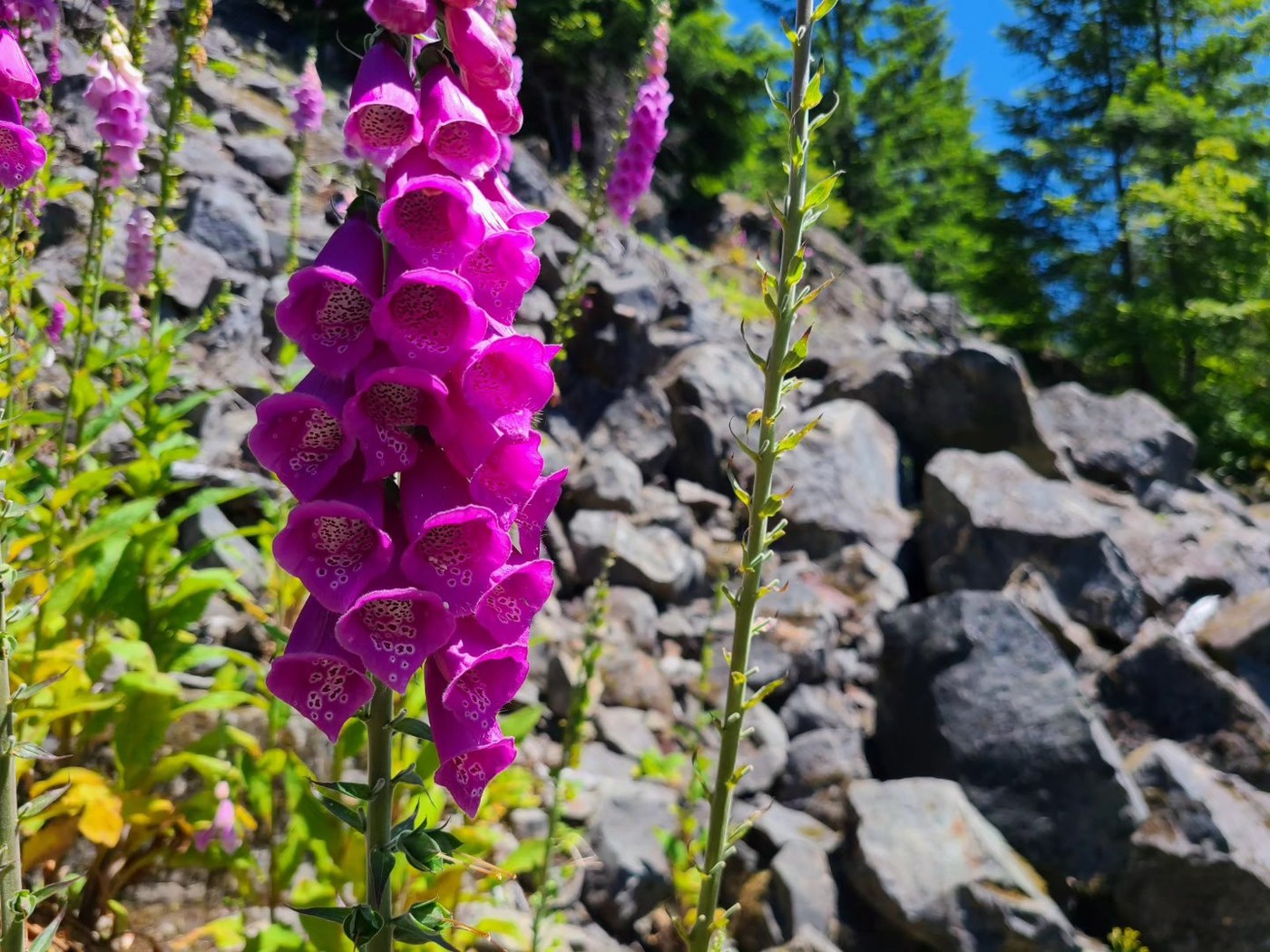 Berry alert! Red hucks and salmonberry are in great supply on the old road segment of the trail lower down. Apart from this we saw wildflowers, most notably foxglove in the open rock fields higher up. The woods are lush, verdant, even a little muggy lower down as the temperature rose in the afternoon. Most of the trail is nicely forested and shady.