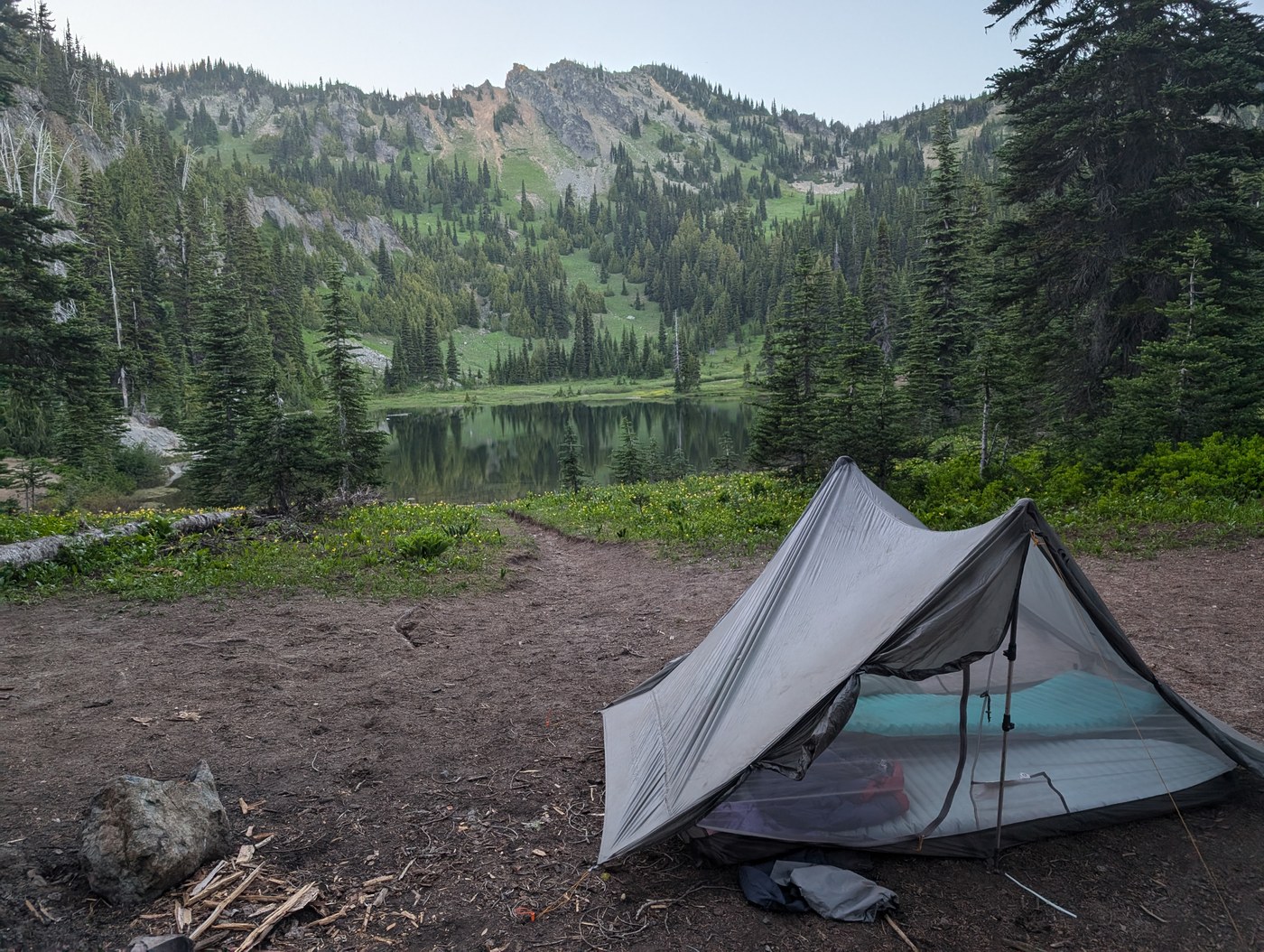 We left American Lake and trudged back through the snow to the PCT. Heading North, we passed many beautiful lakes and valley and mountain views. At noon, we reached our car at Chinook Pass, where we got fresh clothing, a resupply of food, and a beer. The cooler was still full of ice and the fresh food was cold. We hiked to Sheep Lake, another 2 miles, and made camp. I improvised a double boiler to melt chocolate to dip marshmallows in, which worked well. Continuing the white noise theme, at Sheep Lake it was very windy. It was the first time I felt cold on this trip.
