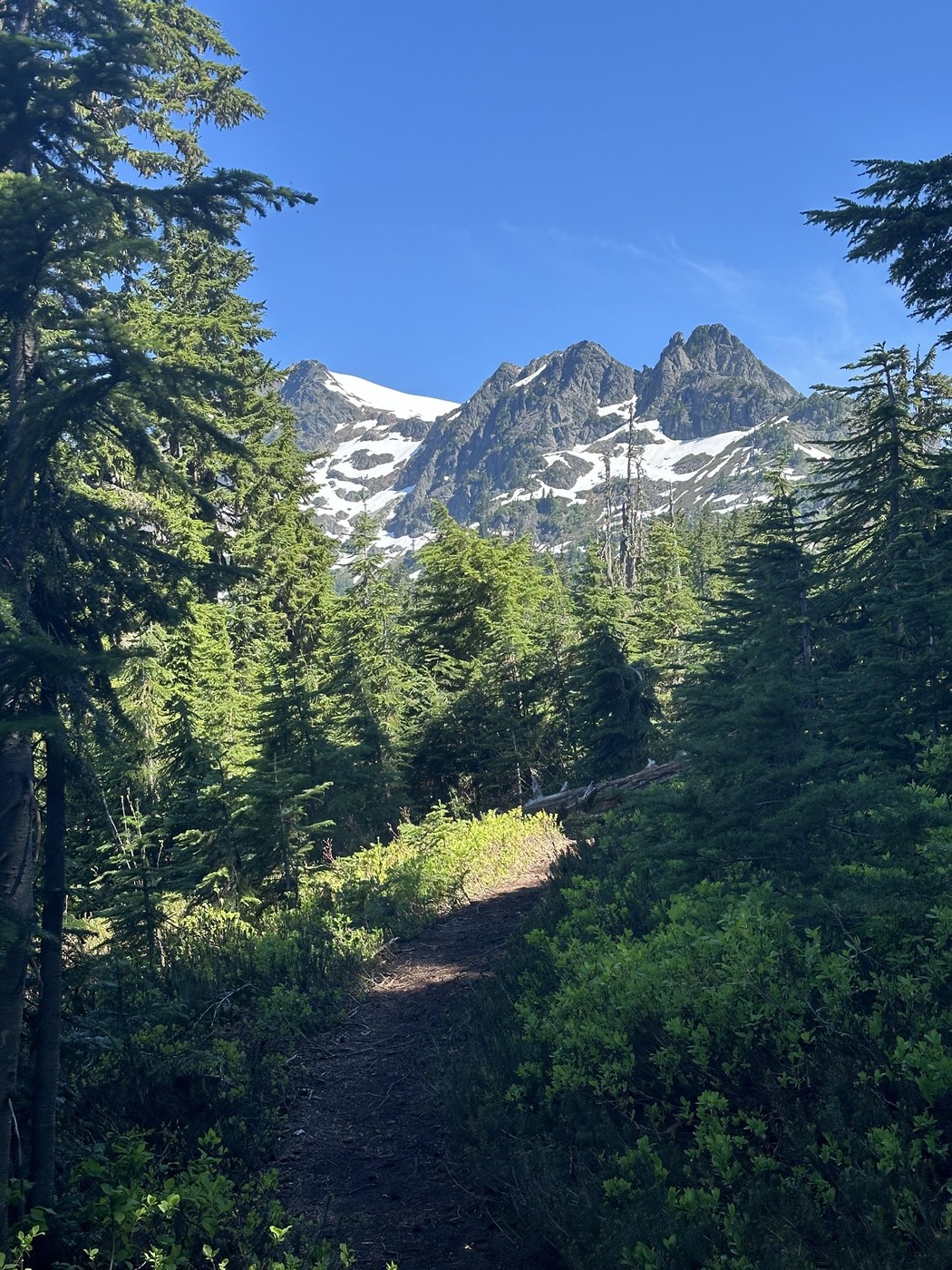 Beautiful hike with very few people. Views start around 2.9 miles but had wildflowers on way up. Opens up to ridge with great 360 views of baker, shuksan…. Snow started about 3.4 miles with intermittent and then more patches. Bugs going up but not bad but mosquitos in force at ridge when got to snow. Very clean and well stocked privy and garbage cans. Followed with paddle board at baker lake.
