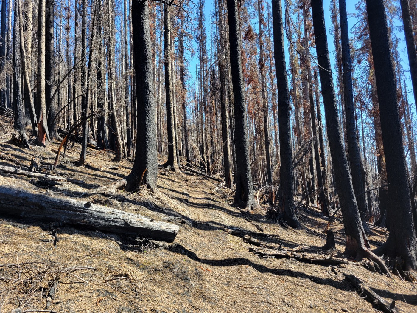 1) Burn zone, but someone's really cleaned it up quite impressively. The unburned part in the last 1.5mi to the top is the worst by far.