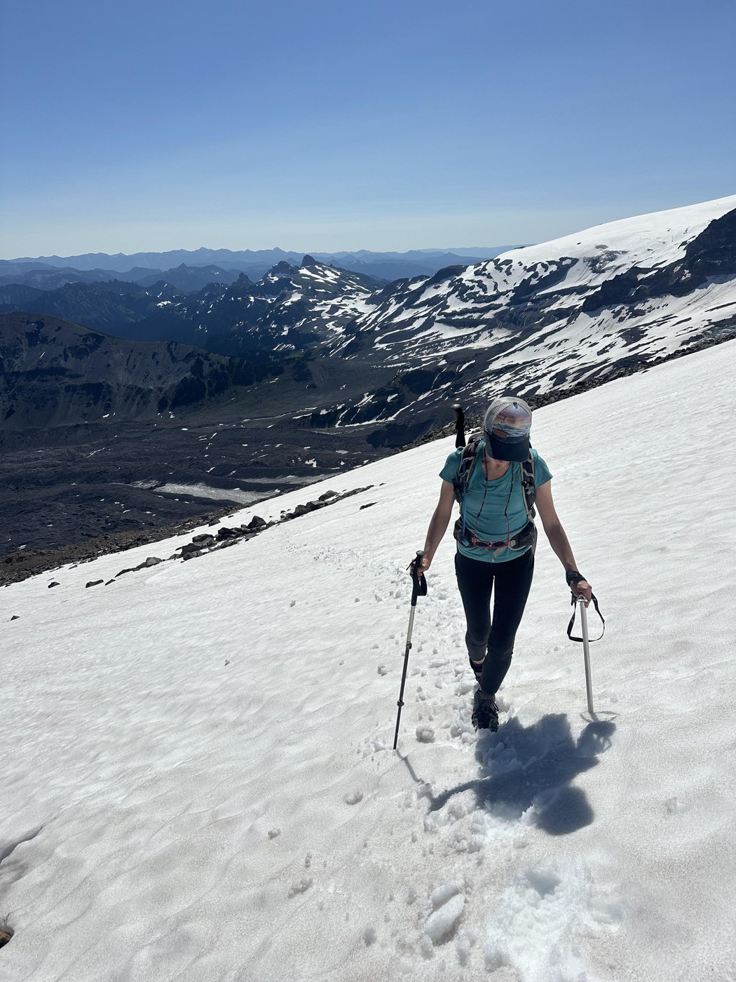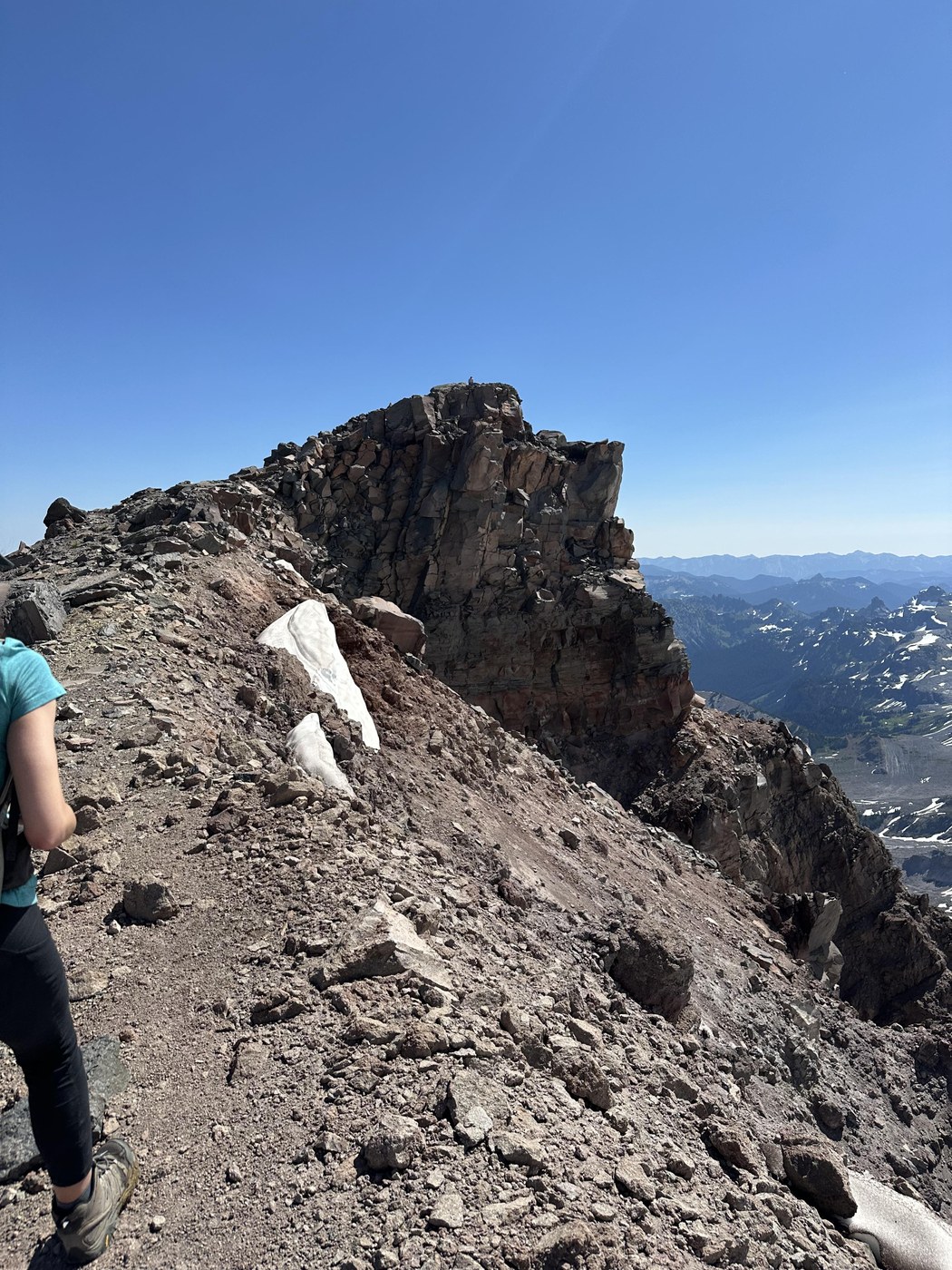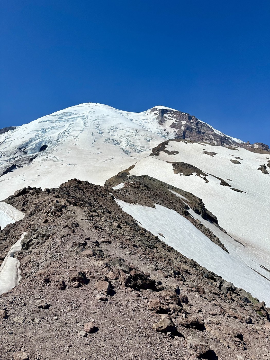 Arrived to the parking lot around 0645 with plenty of parking, though filled up quickly. Left the campground just after 0700. The first few miles to Glacier Basin Campground were an easy, gentle climb. Crossing Interfork river wasn't too terrible, as we took the first left out of the campground and were able to find a spot to hop across. From there it was a bit of a "choose your own adventure", though there is a trail that will take you past some mining equipment. From there, we came across the first ridge climb. This was my second time on the mountain and the first time, we took the first ridge you come across up, then had to cross a snowfield to get to the summit ridgeline. This time, we crossed a snowfield to get to the "middle ridge", which was a bad idea (a lot of scree backsliding). There is a trail on the far left ridge, which you need to cross two snowfields to get to. I would recommend getting over to the far left ridge low down before you start climbing, but be aware of the snow bridges that are melting out. Once you get to the main ridge line, it's an easy trail to follow. We climbed the boulder field for quite a ways before getting out on the snow to traverse to the final ascent. We used microspikes and an ice axe. The snow was soft by this time to allow a boot pack trail. You'll want to cross the snow fields all the way to the far rocky ridge, where you will be able to summit along the boulder field and avoid the snow. Summit was beautiful with a great view of Rainier and Steamboat Prow. We watched a helicopter rescue from Camp Shurman while eating lunch up there as well. After spending some time on summit, we headed back the way we came (though this time followed the true trail the entire way down). Overall a great day and we only saw two other people on the mountain that day!