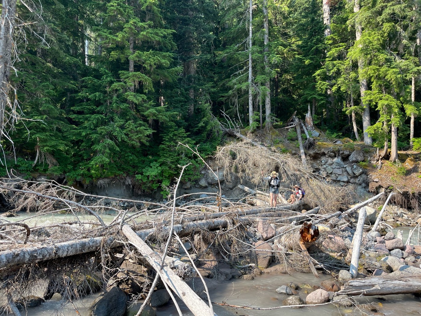 This is when the real adventure began. We started our descent into the White Chuck river valley with varying levels of optimism. The trail loses ~3k feet in 1.5 miles, zoinks!! We batted our way through the brush and clambered over/under/around >50 blowdowns (we lost count lol). The descent took us a solid 2.5 hours. After getting close enough to see the river the trail disappears (approximate coordinates: 48.11857, -121.19714), but now begins the fun game of finding a safe way across. We got endlessly lucky and found a copse of trees that had succumbed to the eroding river, creating a great bridge across the mighty White Chuck river! (approximate coordinates: 48.11982, -121.19648)