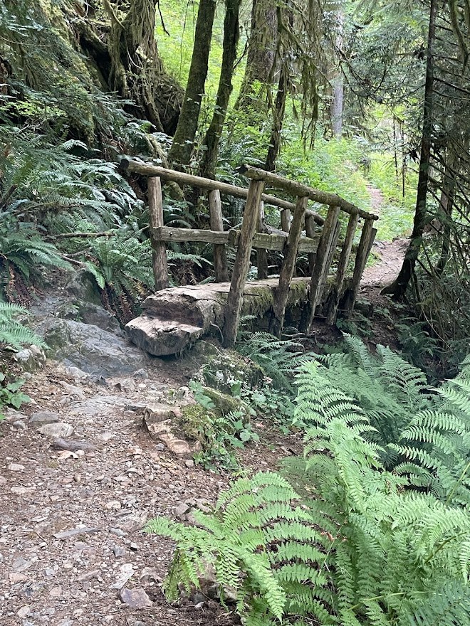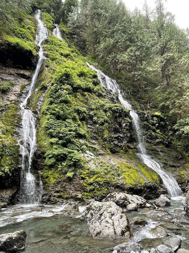 No pass required and no facilities at the trailhead, though there is a shared bathroom about a mile up French Creek Road. It is signed as the only one in the area, which was nice. We arrived at a half-empty parking lot around 9AM, and headed out after a hefty dose of bug spray. The trail to the first falls is wide and pleasantly rolling, though it becomes brushy with a few downed trees the further you go. My hiking buddy and I made it to the second falls and then turned back to make it a 5-miler day. We stopped at the first falls on the way back for a quick snack and some photos. Personally, I think the better view of the first falls is from the trail, so if the boot path to the river is a bit intimidating, you may not be missing much. It was particularly steep and slippery when I was on it, though heading back up was easier.