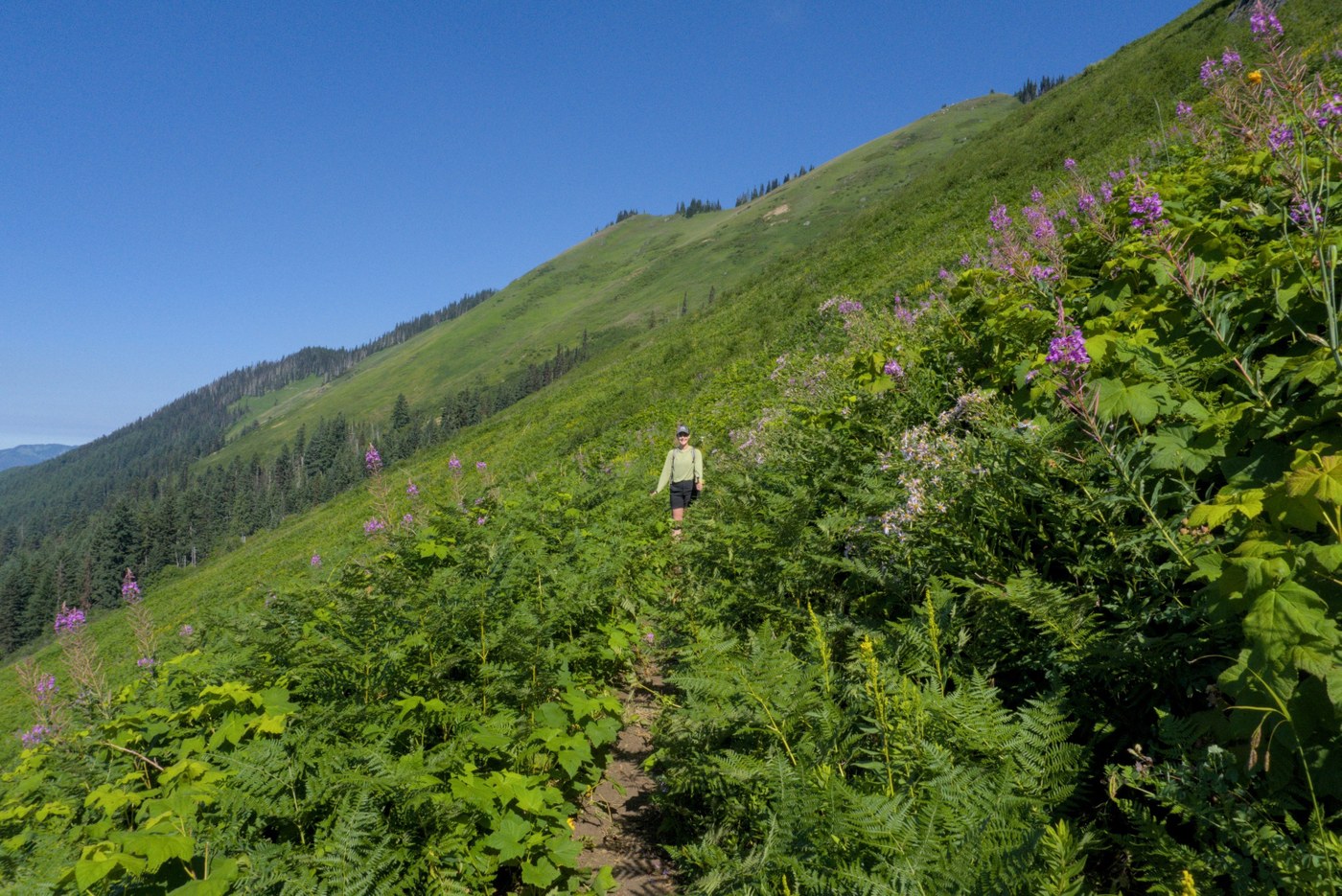 What an amazing hike! First mile is forest, then totally exposed (and overgrown) meadows full of flowers, creeping up into feelings of subalpine until you reach a nice lookout. Great views of Glacier Peak, Dome Peak, Mt. Baker and so much more. Beautiful campsites near a mid-way meadow; this midway point is also the only sorta source of running water. So many marmot dens up the second half of the hike. We saw three young and curious marmots. The greenness of the mountain on this hike is truly one to be named after :) So many beautiful rolling hills of diverse flowers right now!