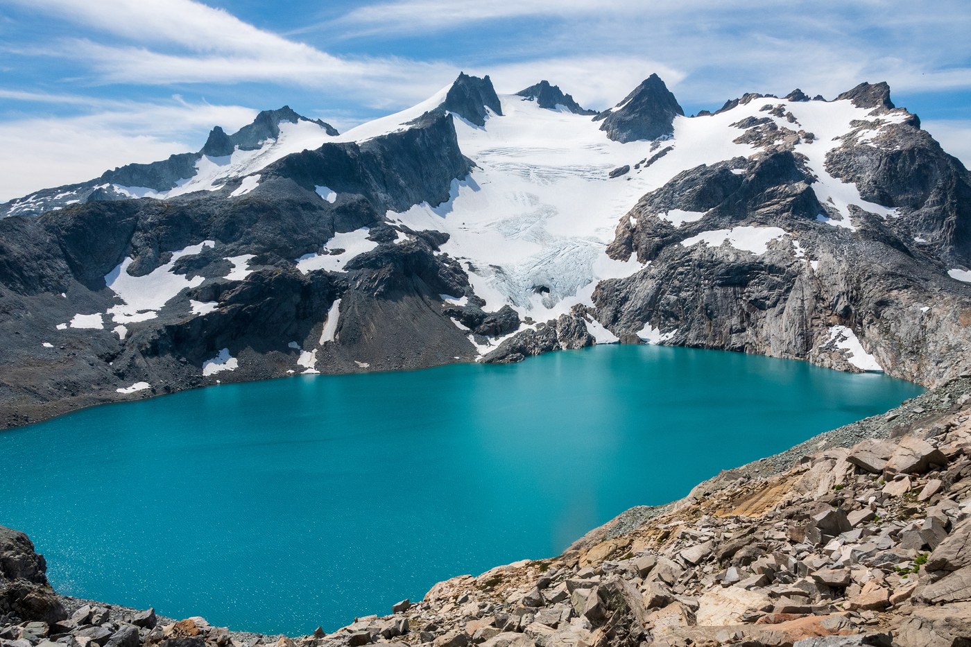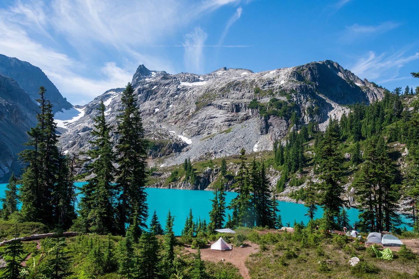 The day hike up to Jade and Dip Top Gap is a must-do and not as strenuous as I expected. The short stretch around Marmot is actually among the rougher parts of the trail, with steep rooty slopes and a few blow-downs to clamber over. Navigating the talus chutes was no big deal going up, especially given how busy the trail was, but look for cairns if you get turned around. Before long, you’ll climb into the lovely alpine meadows between Marmot and Jade. No Name Lake is surprisingly pretty and there’s a nice campsite at the far end that was empty when we came through.