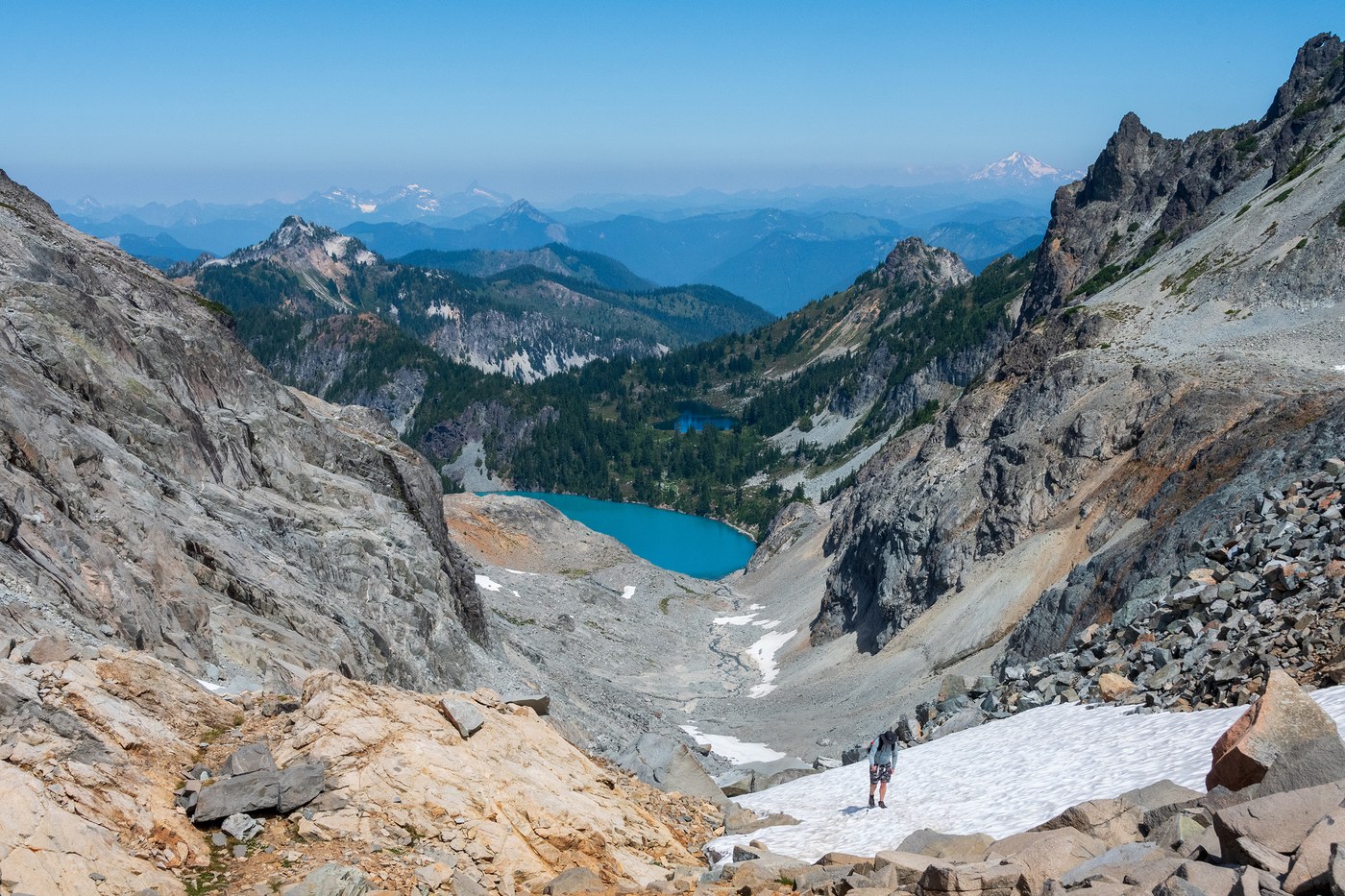 Bear left for the informal route to Dip Top, which climbs steadily past more campsites before making a short but steep and loose descent back to the lake – poles are very helpful here. The rest of the ascent to the gap is straightforward, with several routes up the valley, and we did not bring or need spikes on the snowfield. The view of Pea Soup Lake, Mt. Daniel and its Lynch Glacier is stunning and the bugs were much reduced up there. We stopped at the gap, but others were continuing down to Pea Soup, and one brave guy was even swimming in the glacier-fed water.