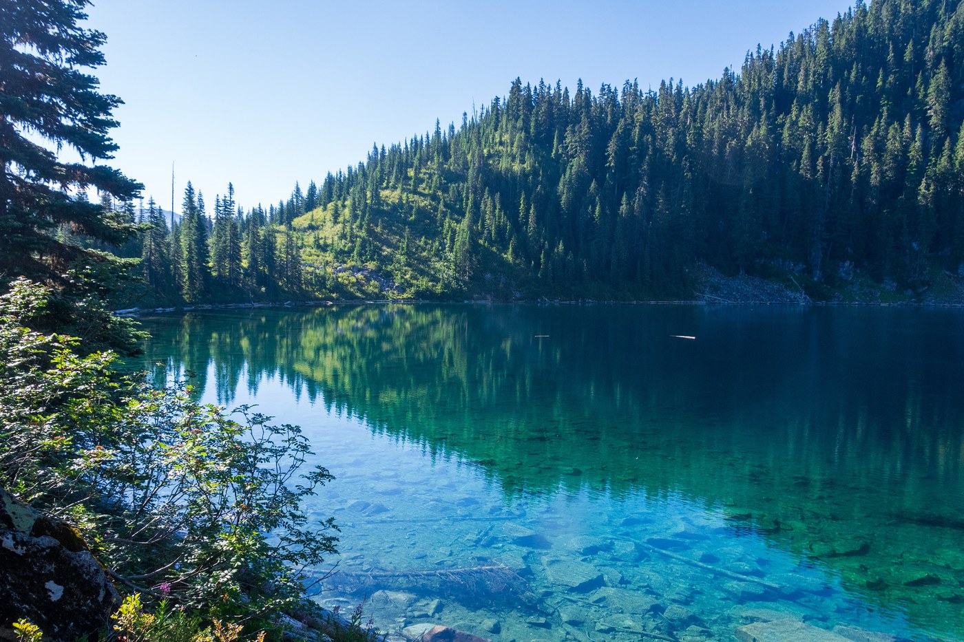 We’d planned for three nights at Marmot, but since we’d done the main day hike and were tiring of the ravenous bugs, we opted to break camp on Sunday morning and head for Lake Clarice. This short trail is obviously much less used, as it quickly gets brushy in places after the turn-off. The lake itself is pretty enough, but not as dramatic as Marmot or Jade, and there’s no obvious easy access given the shoreline is consistently steep and rocky. We also saw just a couple of small and shadeless campsites, although the bugs were maybe a little better. It wasn’t compelling enough to stay another night, so we headed down a day ahead of schedule.