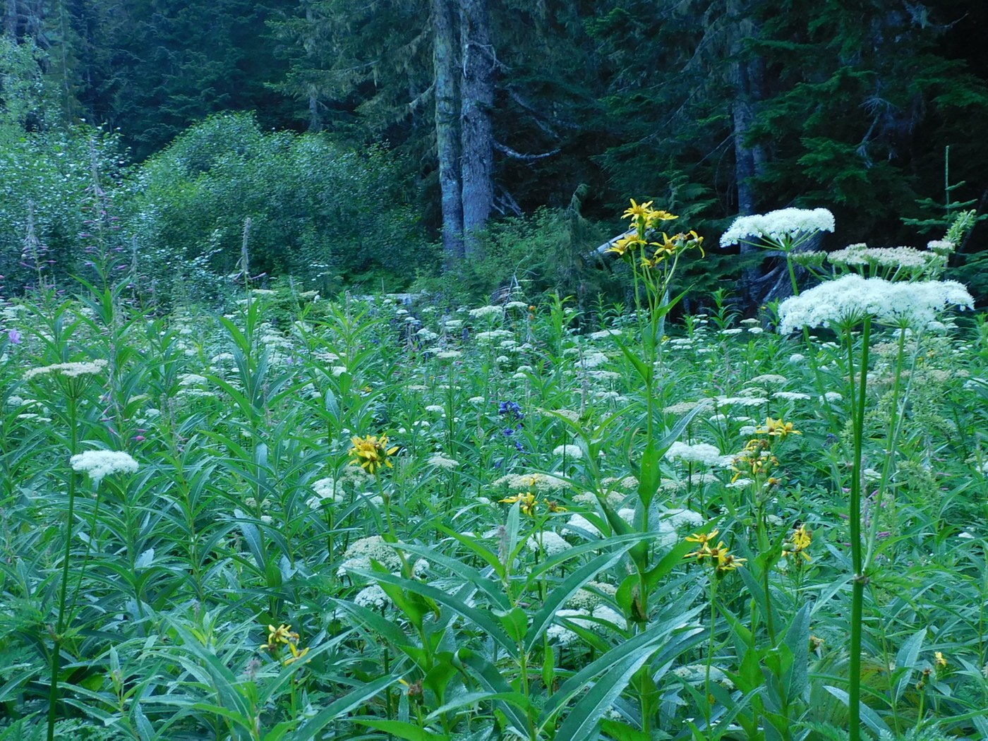 I was lucky enough to get a close-up parking spot around 7:30 am on a Sunday. By 8 am I was starting my hike. I finished just before 8pm, hence I spent the entire day in Spray Park. Like Aline Wanderer's post on Spray Park, I hiked 12.3 miles and gained around 2800 feet in altitude. I did go up toward Observation Rock but stop short when I needed to climb up rocks. In my younger days, the rocks would not have been a problem, but now, my eye site is not as good as it should be, and I knew that going back down would be very slow.