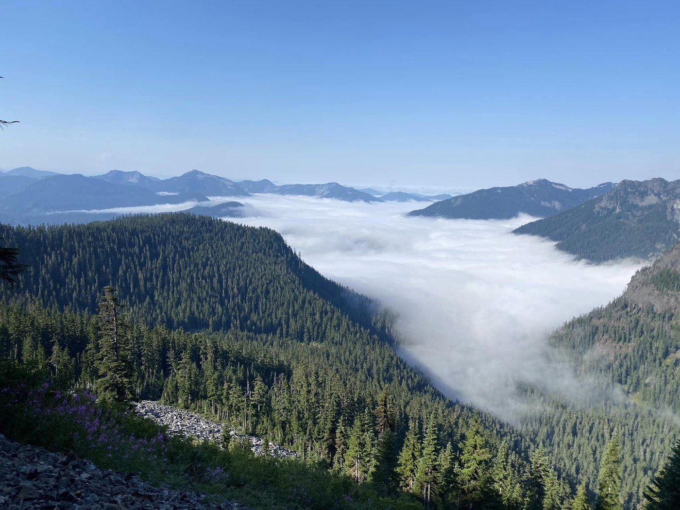 Early was great for avoiding full sun on the open stretches. Talus and scree is par for the course, and I'd argue some of the more stable fields I've been on in Washington. There were huckleberries everywhere, and the trail is in great shape.