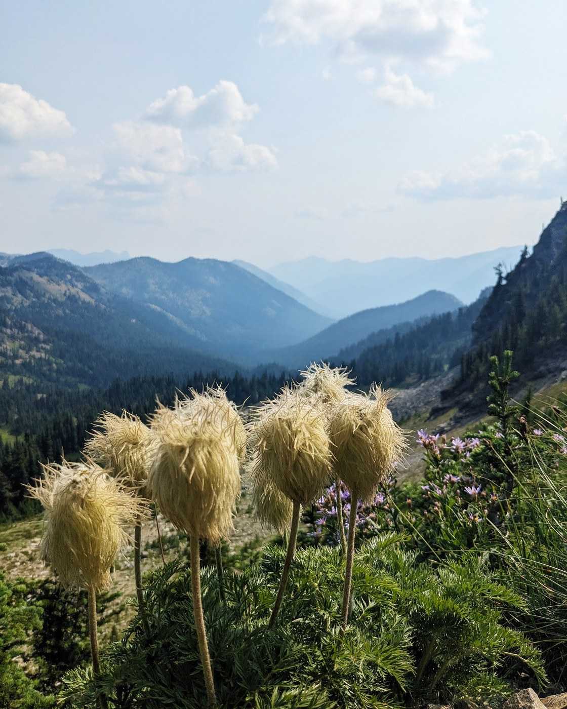On the climb up to the gap, we stopped many times to admire (and photograph!) the abundant asters covering the slopes in shades of purple. I usually give my attention to showier flowers like lupine and balsamroot, but en masse the asters were spectacular! Along the way we also found what seemed to be the first few early ripe blueberries. The trail was lined with bushes, so soon there should be plenty of opportunity for snacking on this hike.