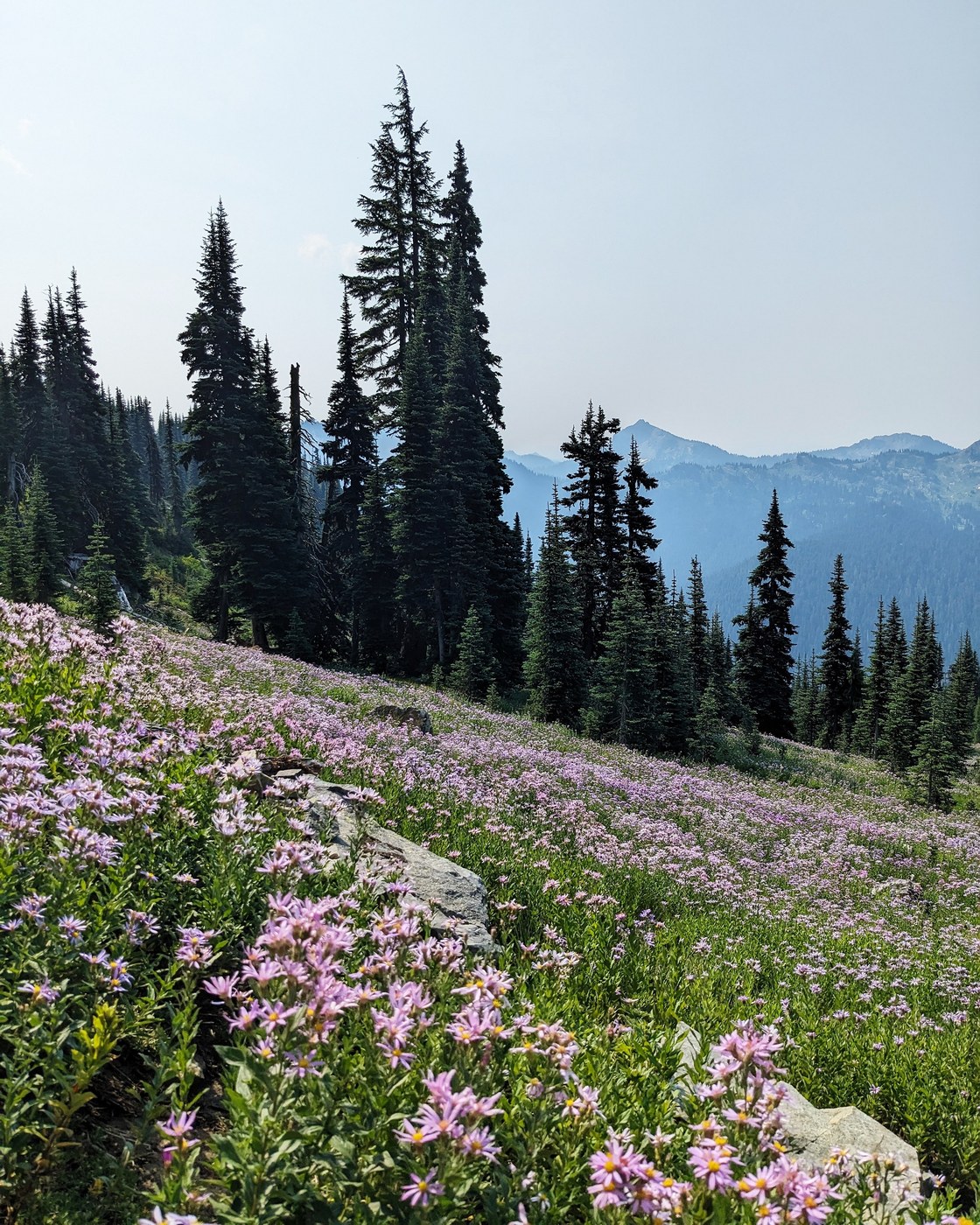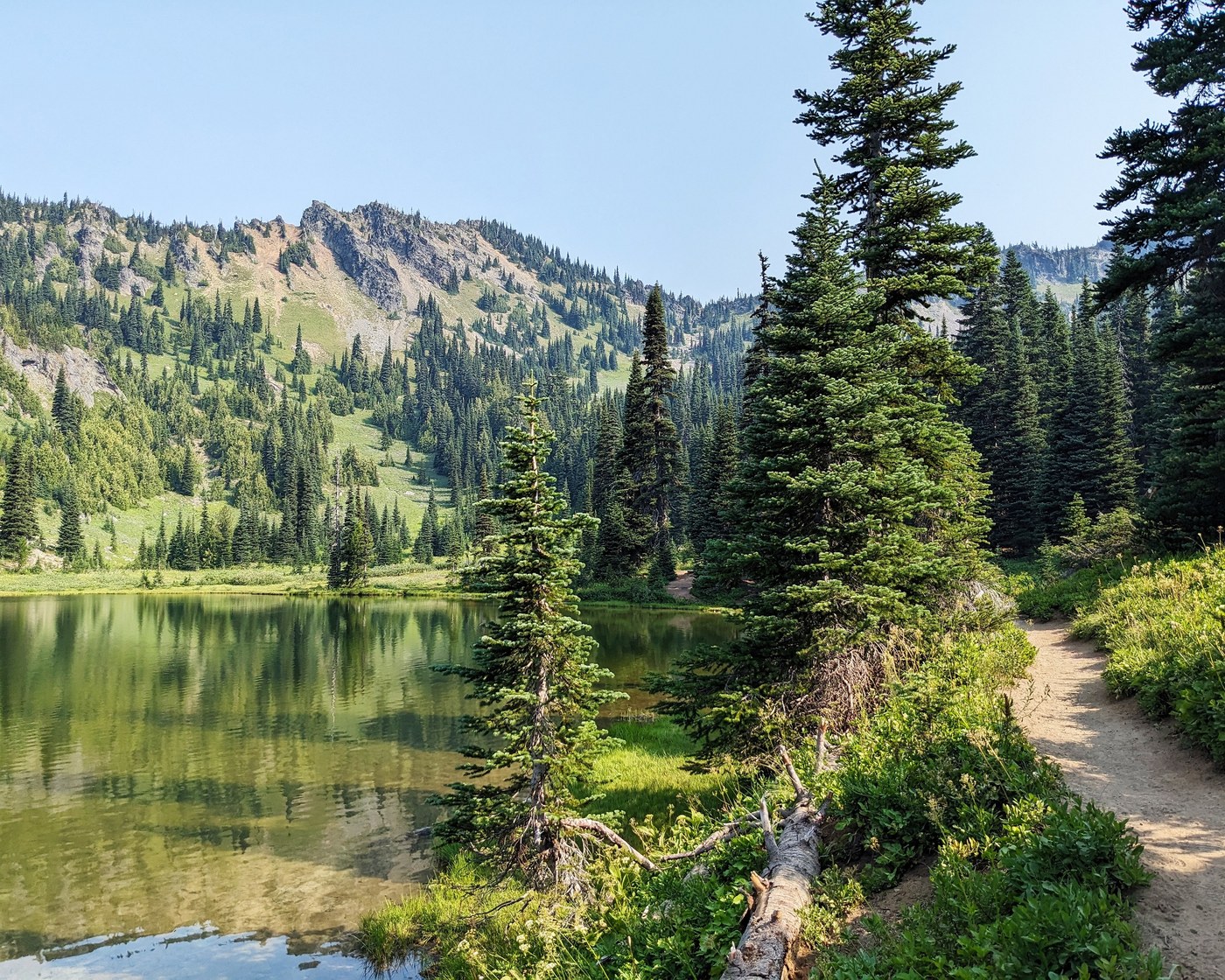 The views from Sourdough Gap were very much worth the climb, even with haze from wildfire smoke limiting visibility. Before turning back, we took a short detour on a connector trail to a knob overlooking Crystal Lake and a partial view of Tahoma.